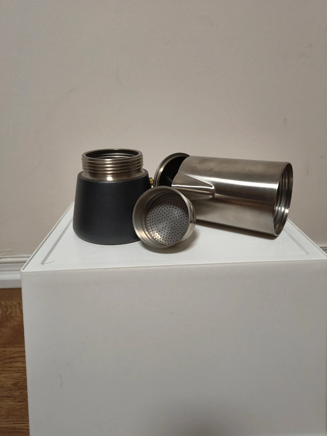 This espresso maker brews rich, authentic Italian-style coffee right on your stovetop. It's crafted from durable aluminum with a classic design. Perfect for making a few cups of strong coffee.