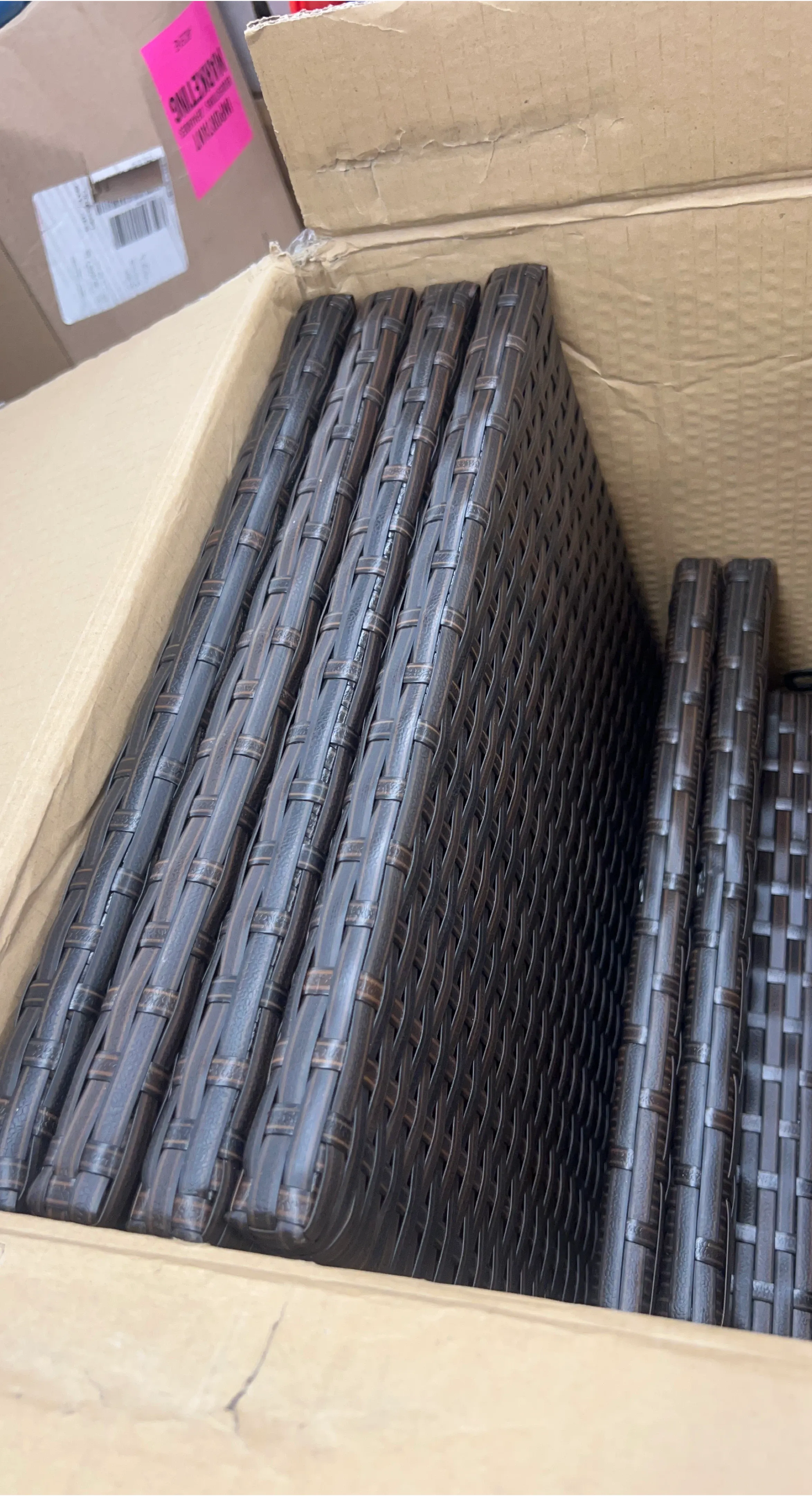 Dark brown wicker dining chairs, likely for outdoor use. The chairs have a woven pattern. They're designed for stackable storage to save space. These would be great for a patio or deck!