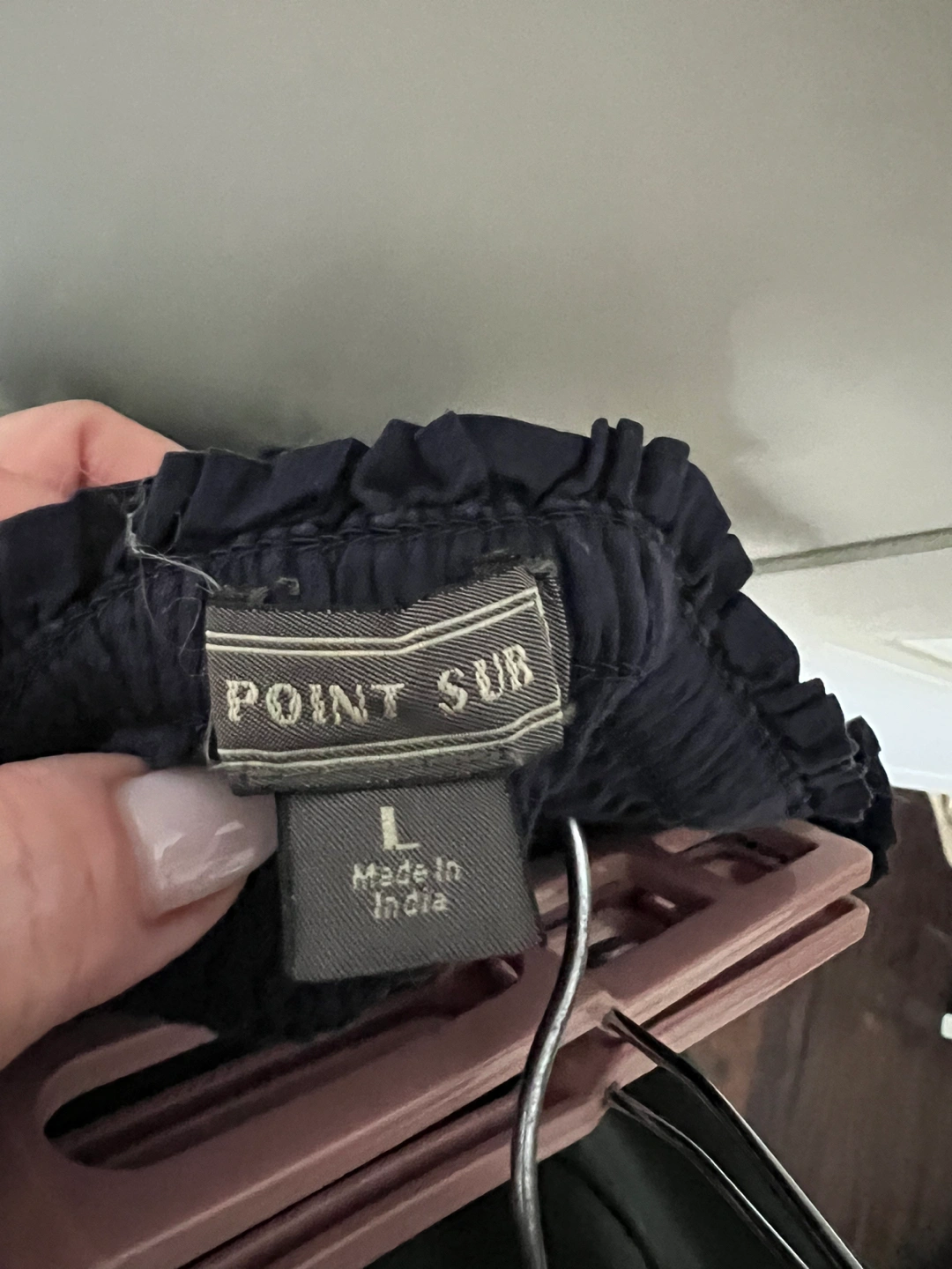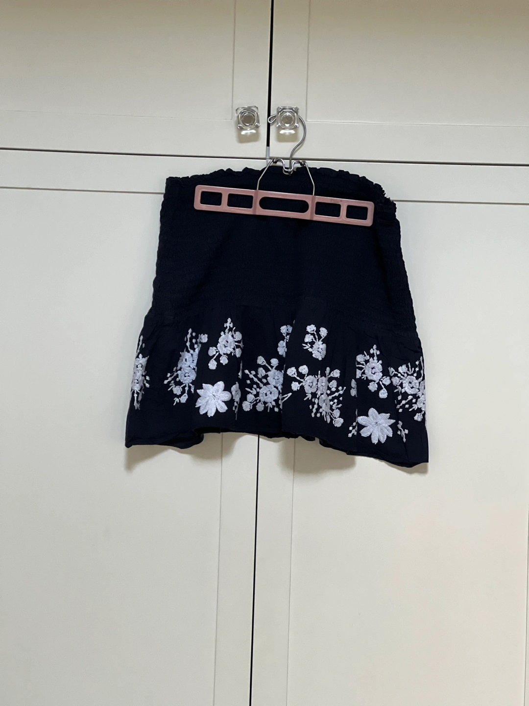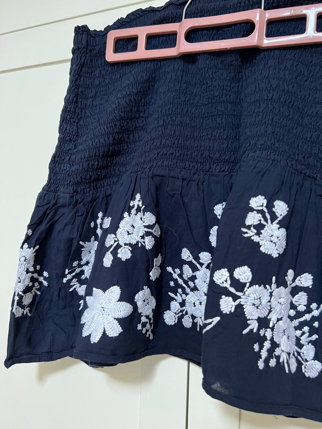 Size L but has elastic waste so would fit anything from a medium to an XL. Embroidered hem. Super cute
