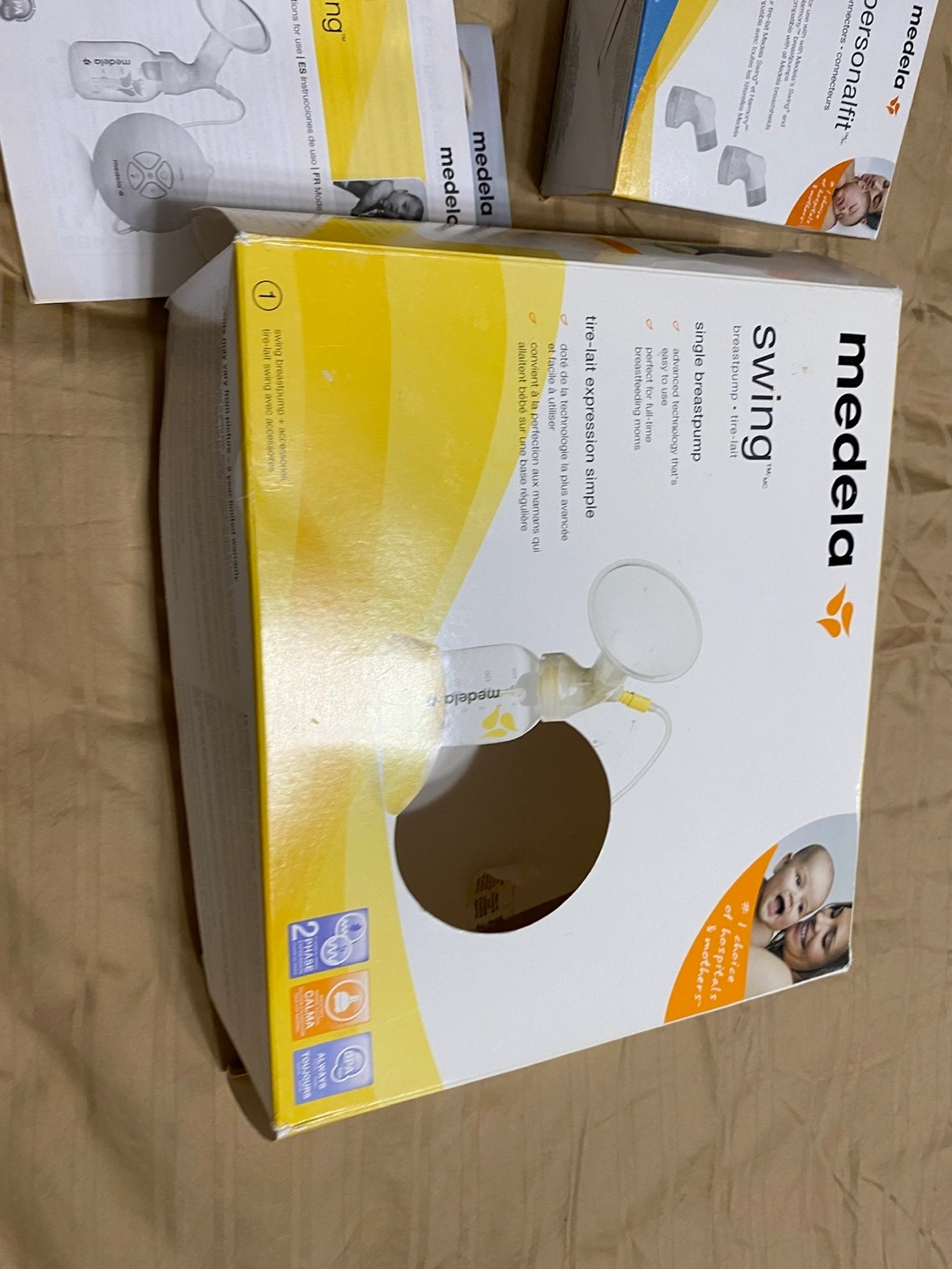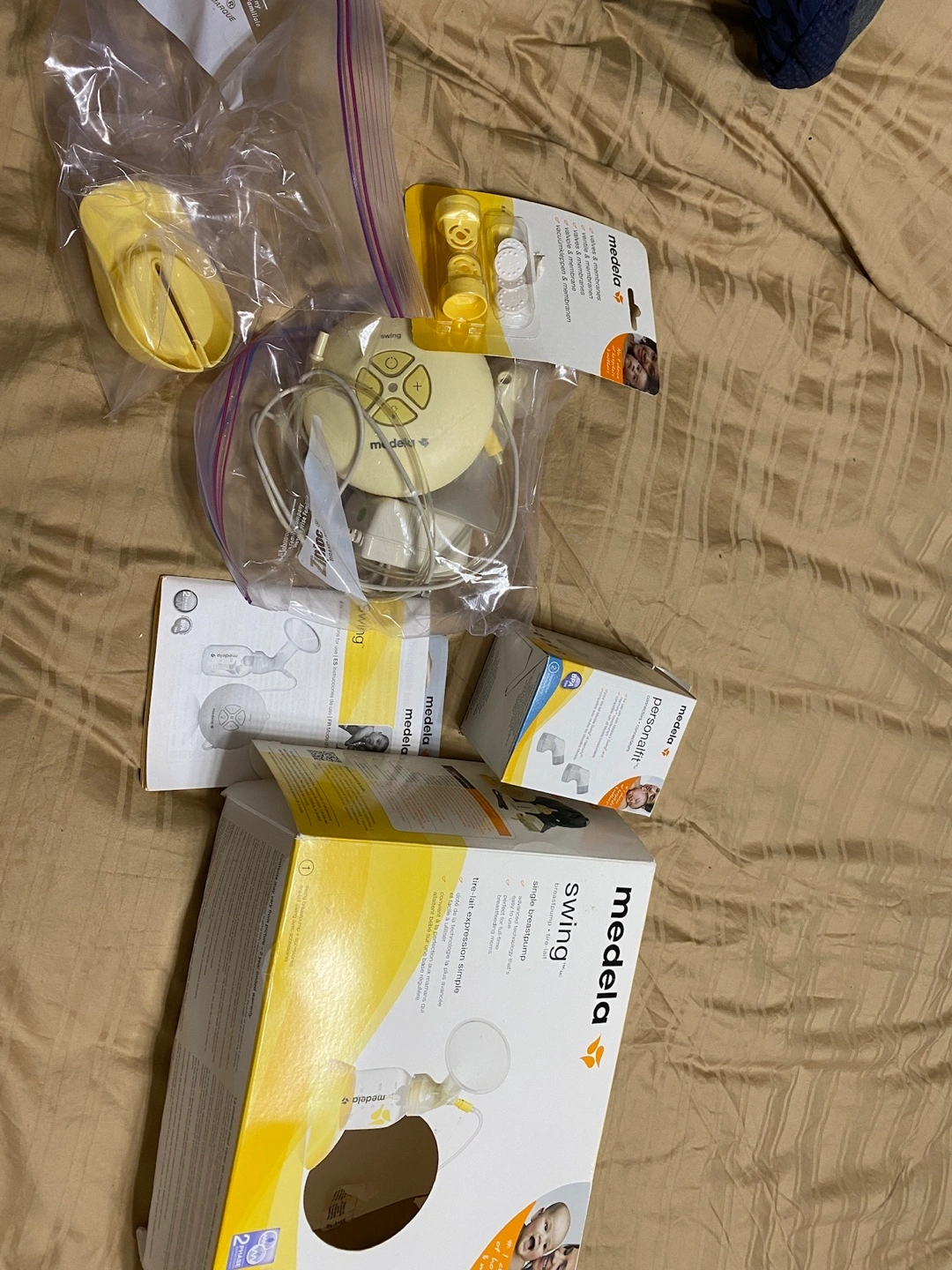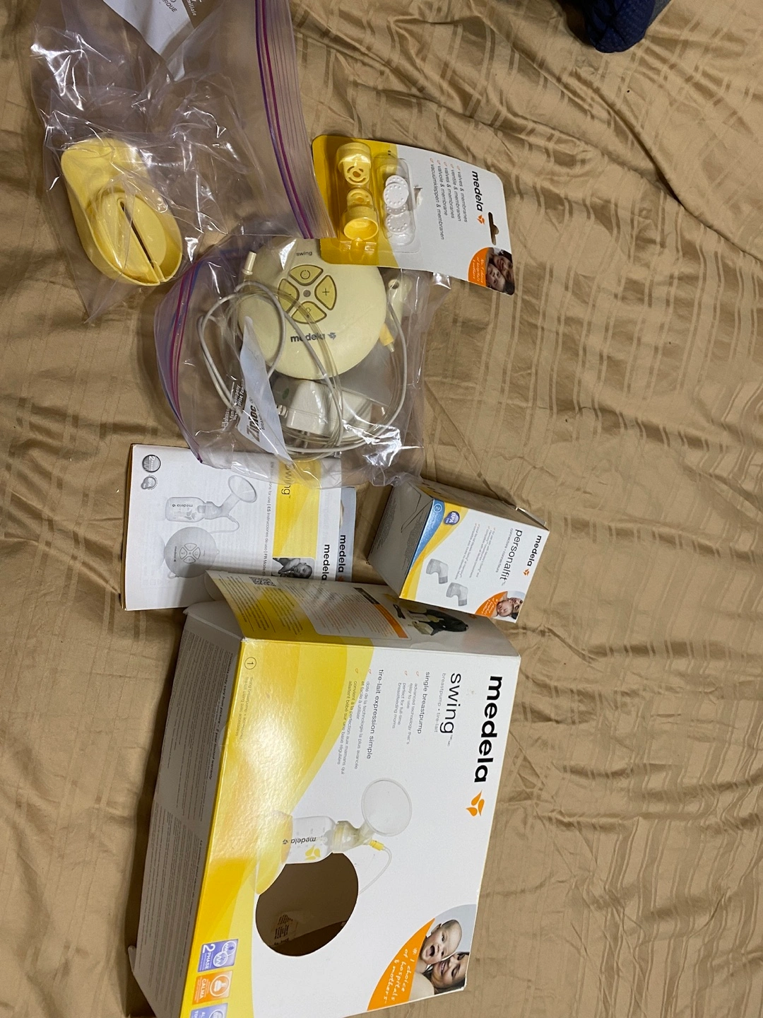 Used Medela Swing single breast pump. Includes all parts shown. Good condition. Comes in original packaging.