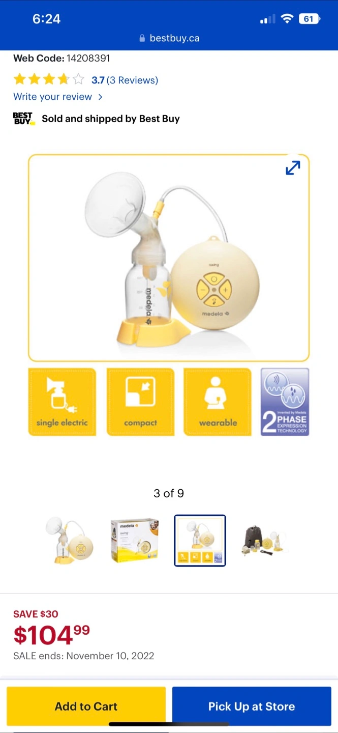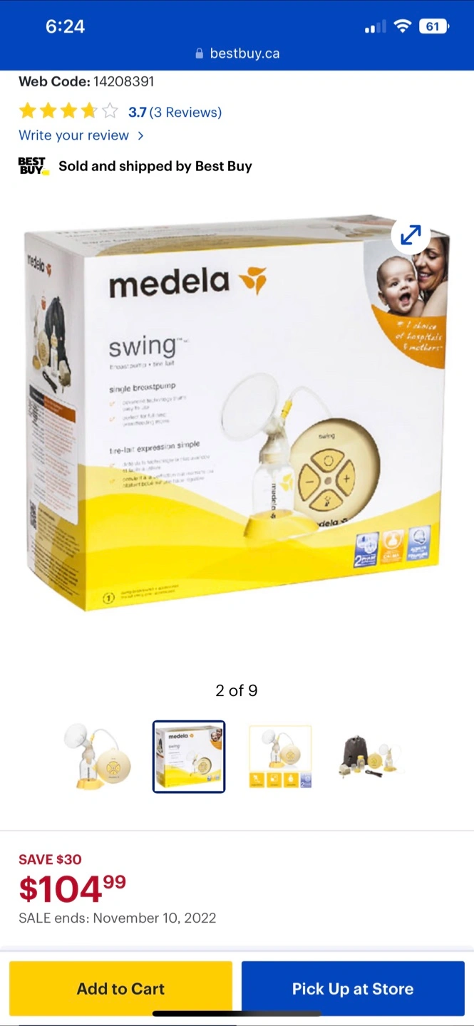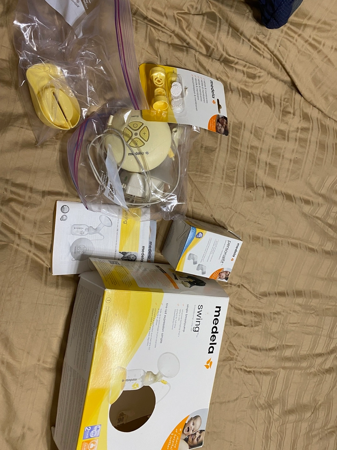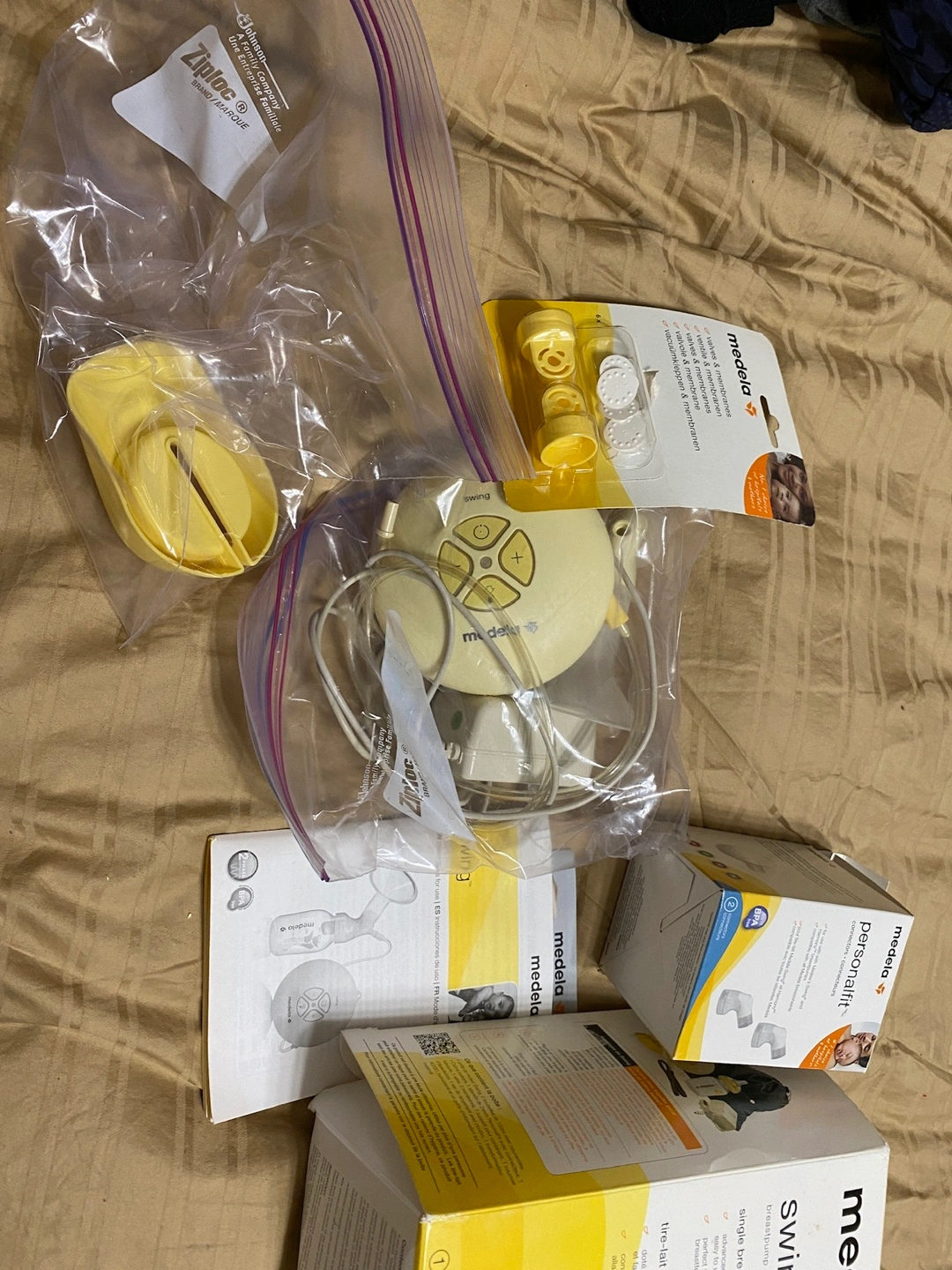 Used Medela Swing single breast pump. Includes all parts shown. Good condition. Comes in original packaging.