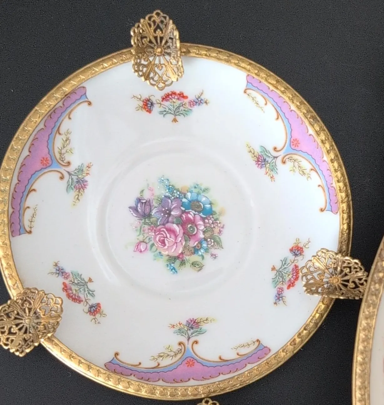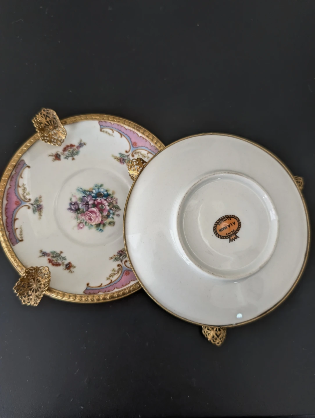 This lovely antique decorative saucer features a beautiful floral centrepiece with gold trim and ornate brass accents. It's crafted from fine porcelain. This piece adds a touch of vintage elegance to any display!