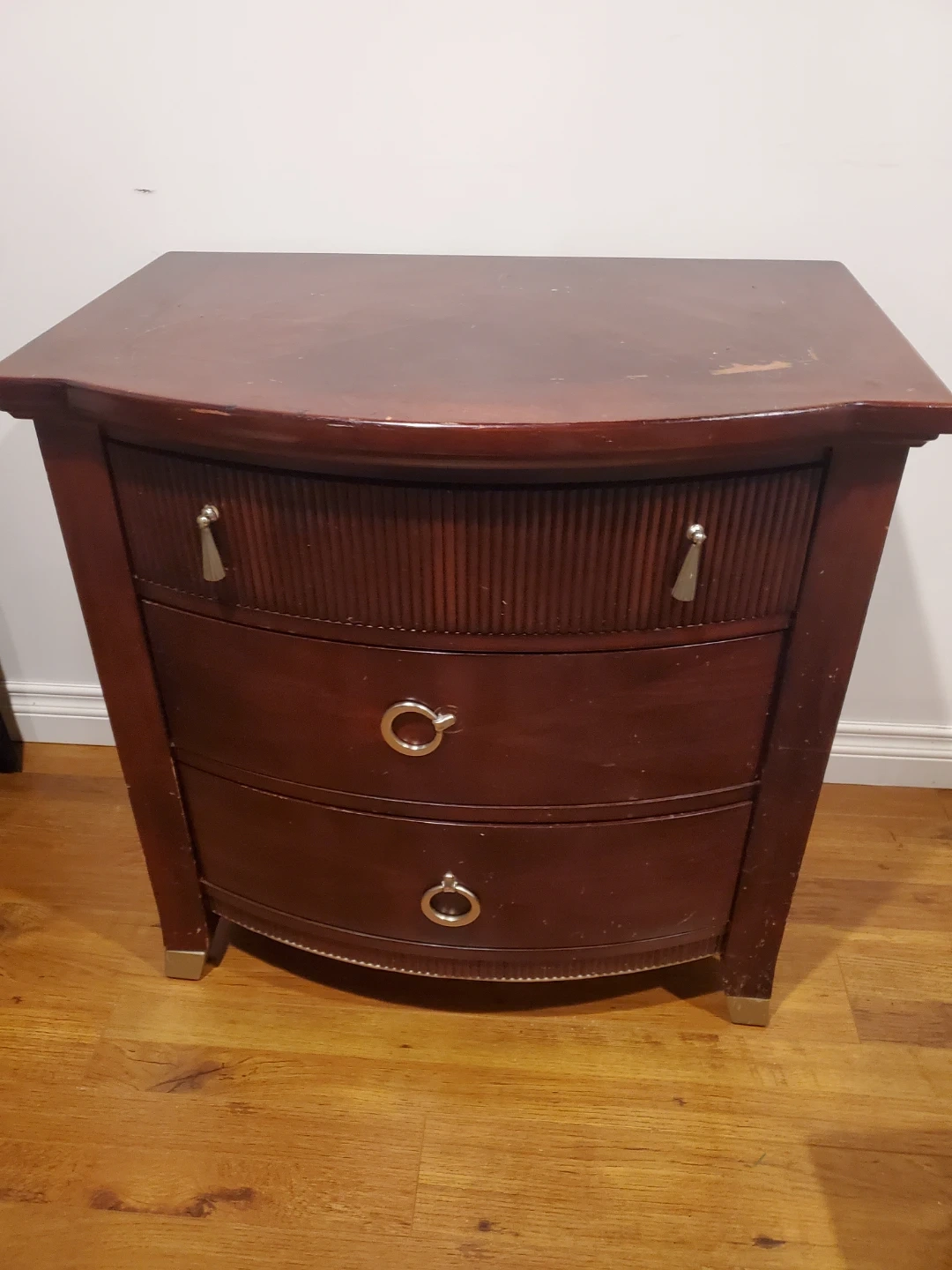 This is a dark wood nightstand with three drawers. It has a curved top and decorative trim. The drawer pulls are silver-toned metal. This nightstand would be useful for storing bedside items.