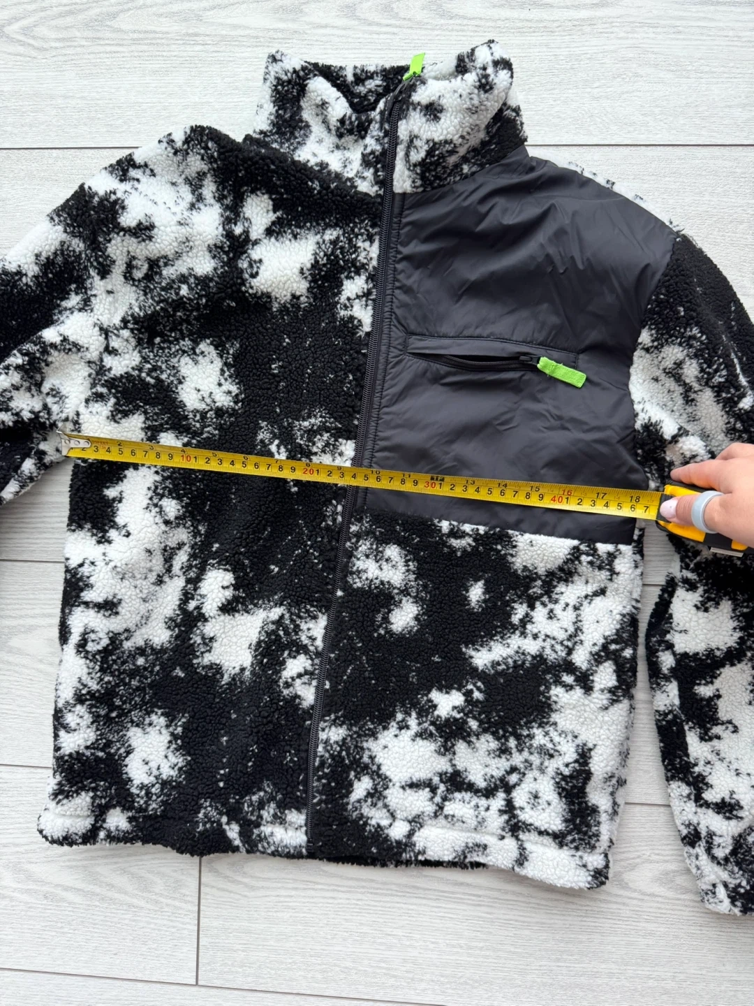 Cozy tie-dye fleece jacket with a contrasting black nylon chest panel. It features a full zip closure and a stand-up collar. Chest width measures approximately 22 inches.