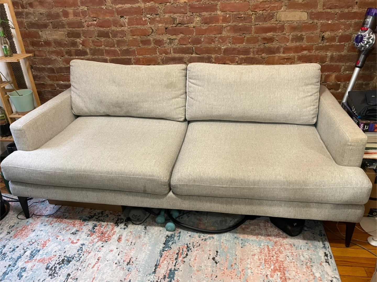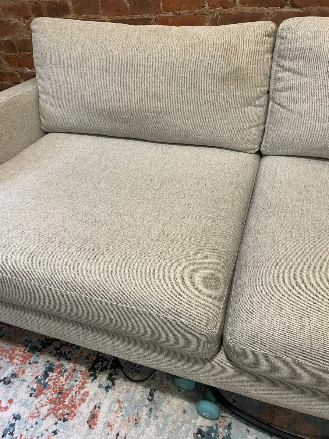 Selling a sofa in Birch Ivory. It's a beautiful and comfortable couch that would look great in any living room. The color is a neutral ivory, and the material is durable. Please note there a two stains otherwise in great condition!