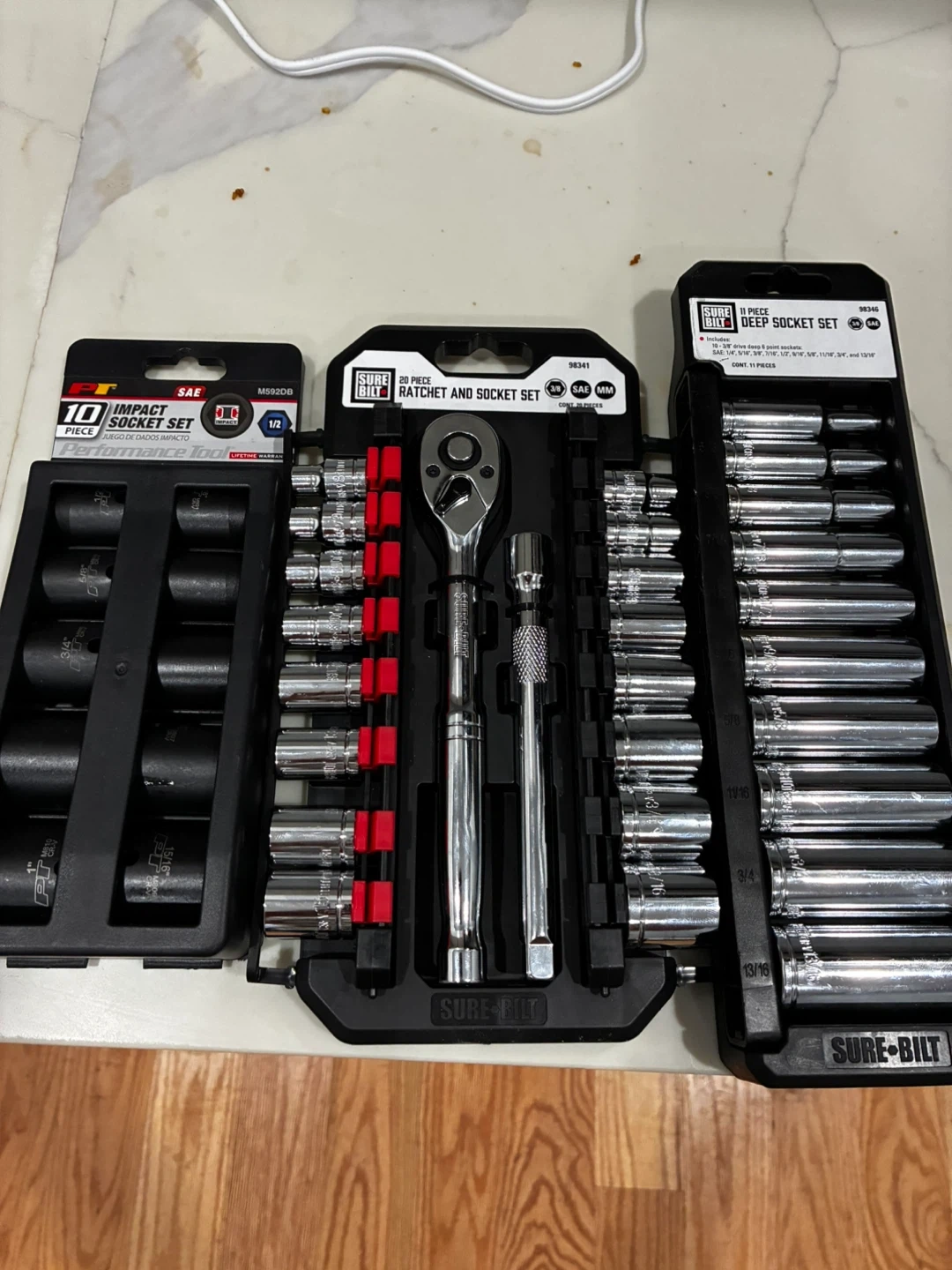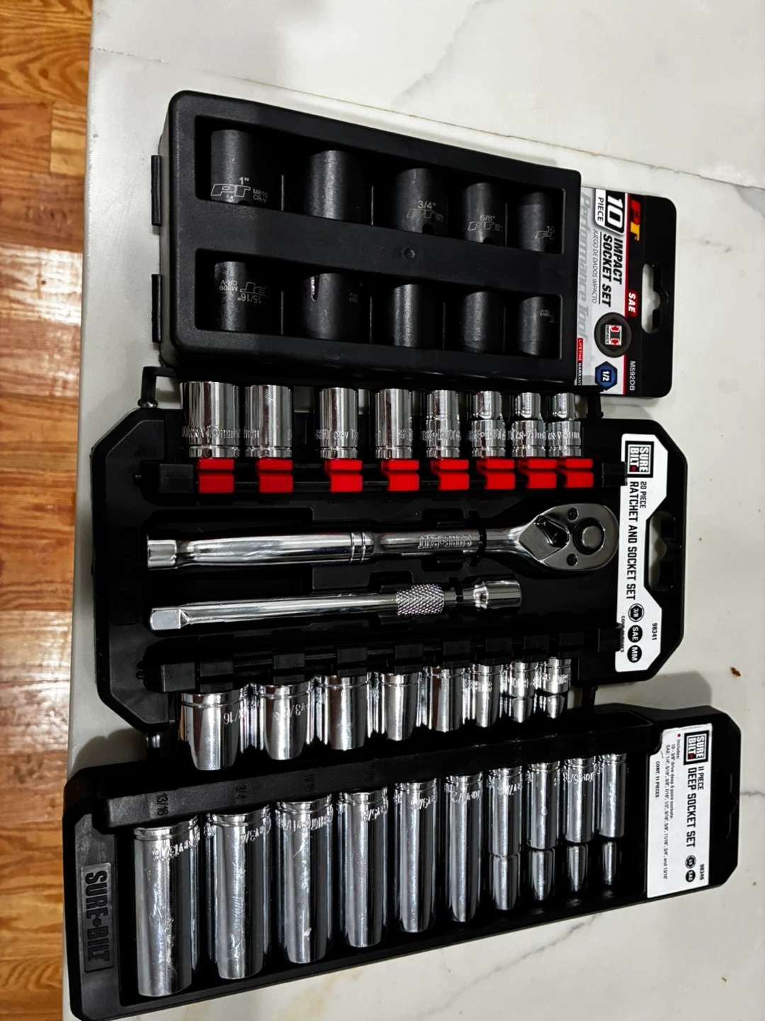 Selling a collection of Sure-Bilt ratchet and socket sets. Includes a 10-piece impact socket set and a deep socket set, plus a ratchet and socket set. Great for any DIY projects or professional use!