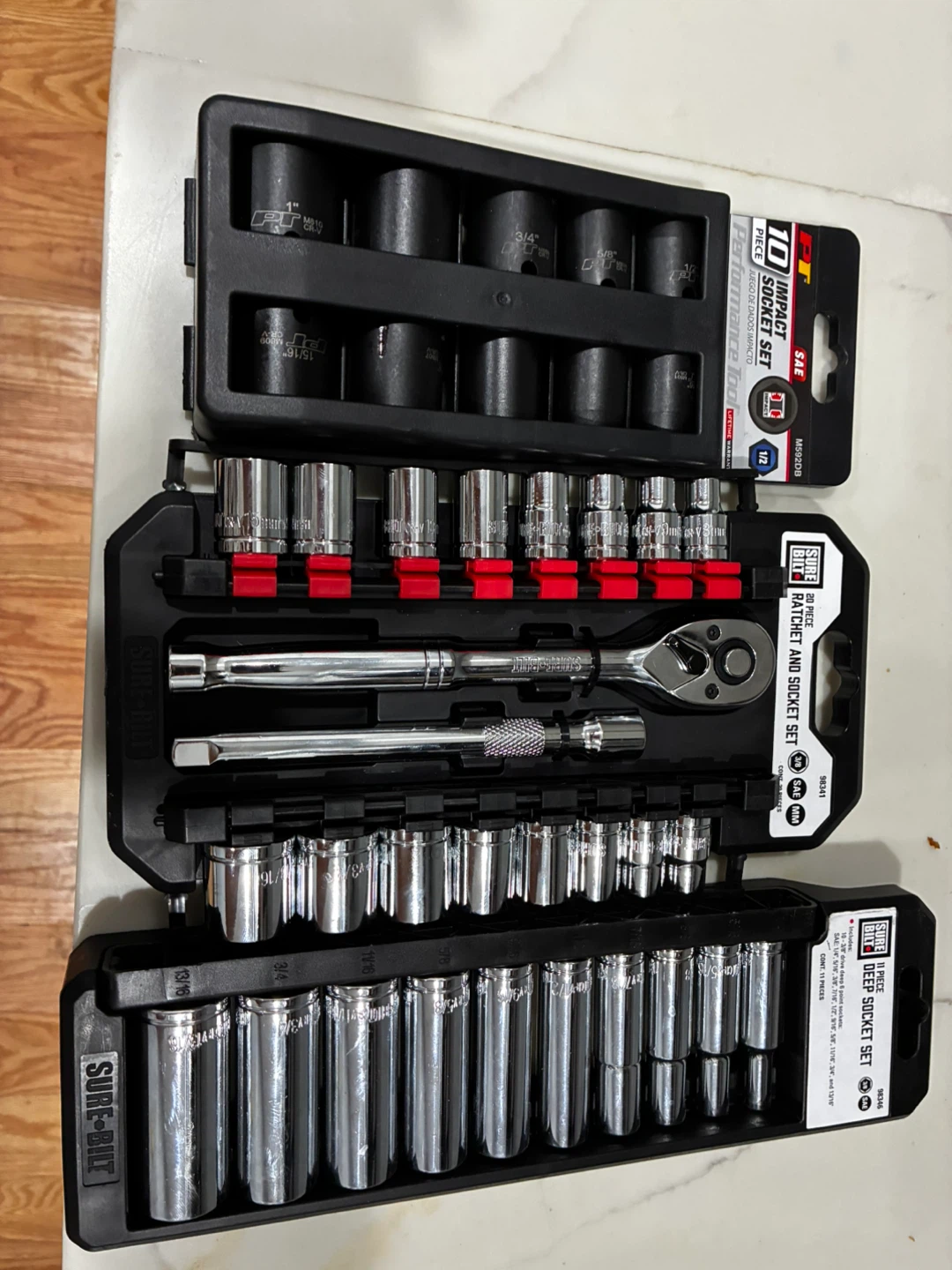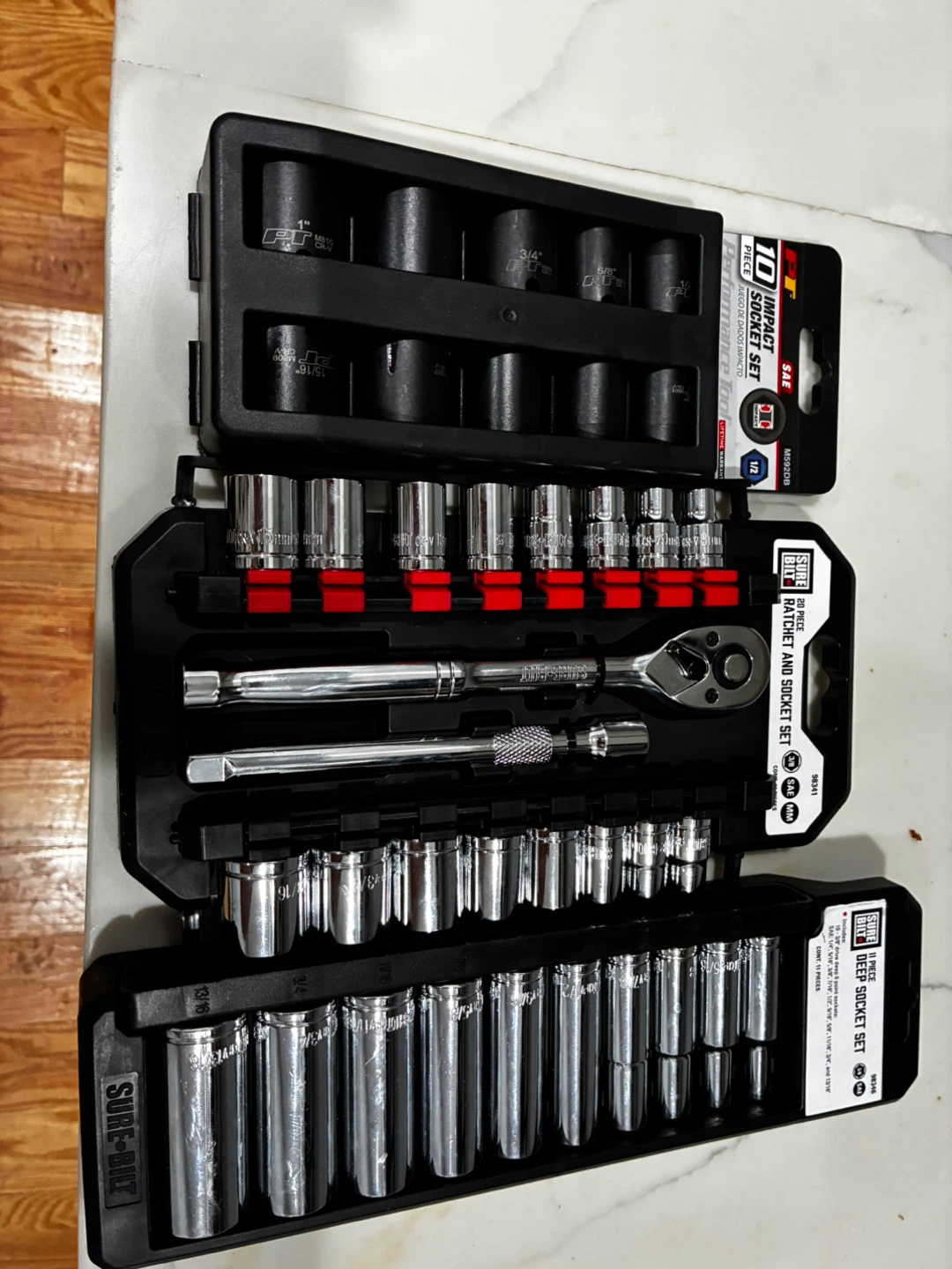 Selling a collection of Sure-Bilt ratchet and socket sets. Includes a 10-piece impact socket set and a deep socket set, plus a ratchet and socket set. Great for any DIY projects or professional use!