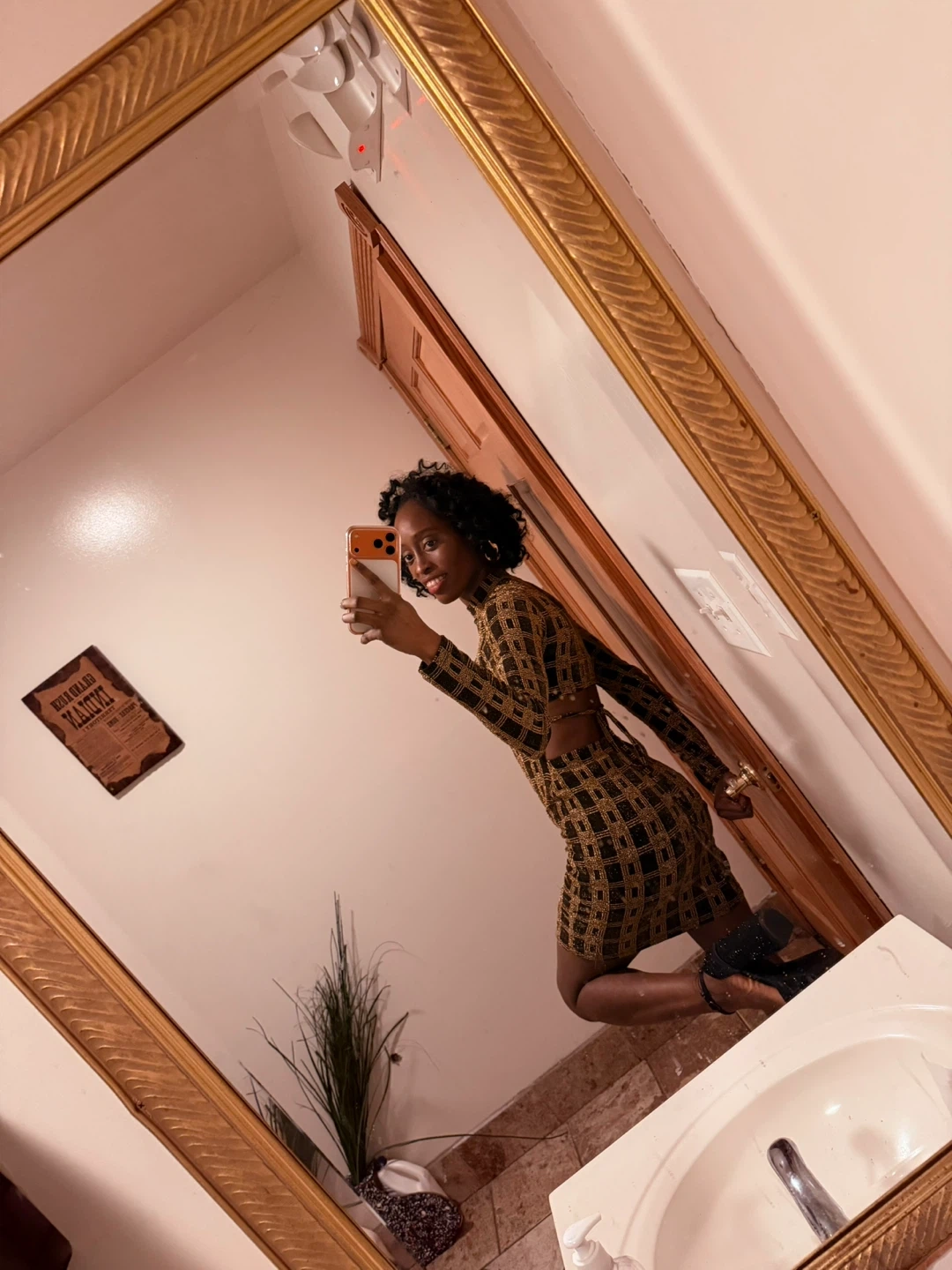 This chic mini dress features a black and gold plaid pattern. It has long sleeves and a cutout detail on the waist. It's perfect for a night out!