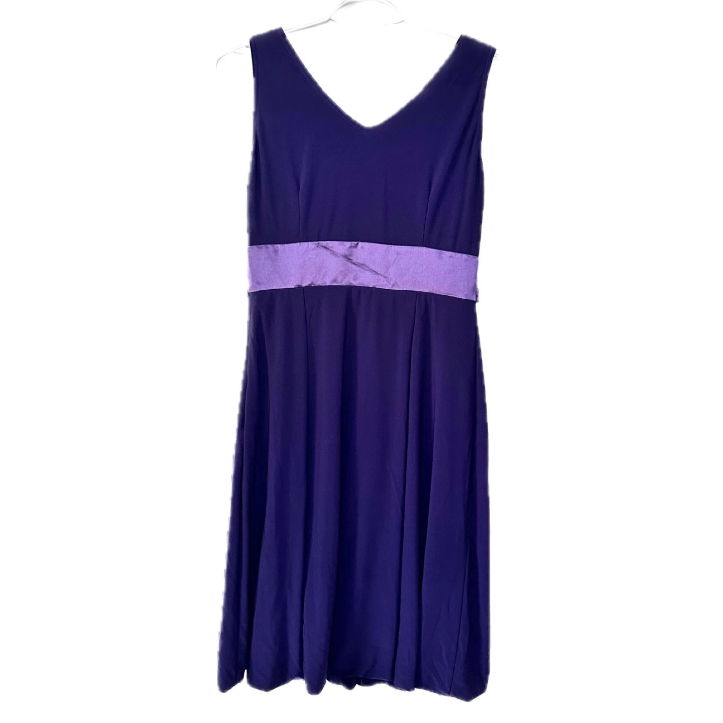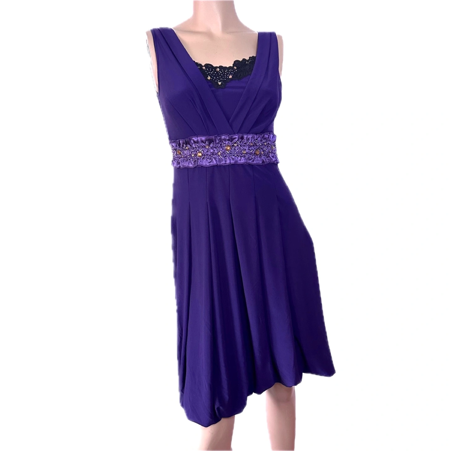 Stunning purple party dress. Features a beaded pleated V-neckline, sleeveless design, and an embellished satin waistline. Knee-length, bubble hem and A-line silhouette. Perfect for a special occasion such as a wedding or a night out.