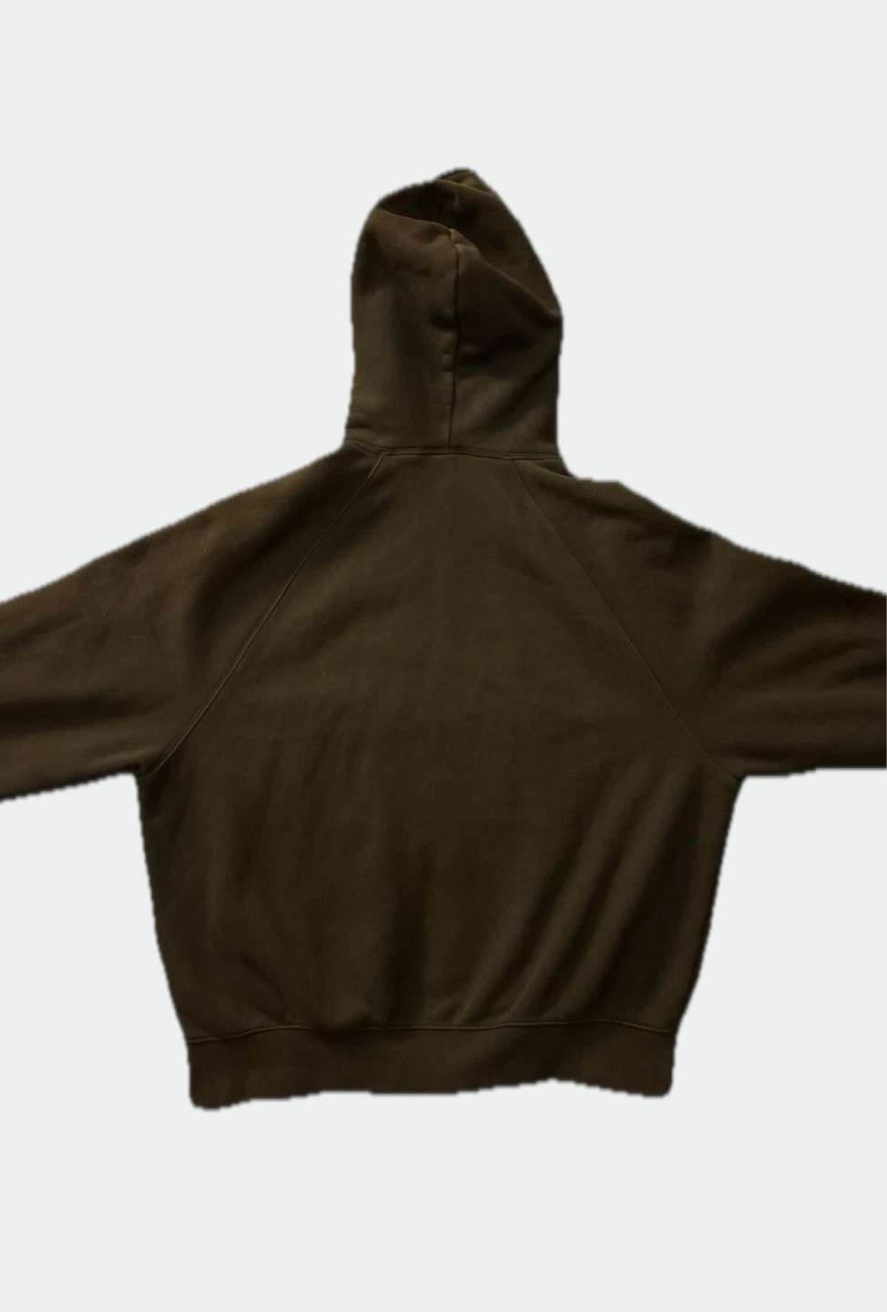 This is an authentic brown Fear of God Essentials hoodie. It has a pullover design with a front pouch pocket and a drawstring hood. The brand name is embossed on the chest.