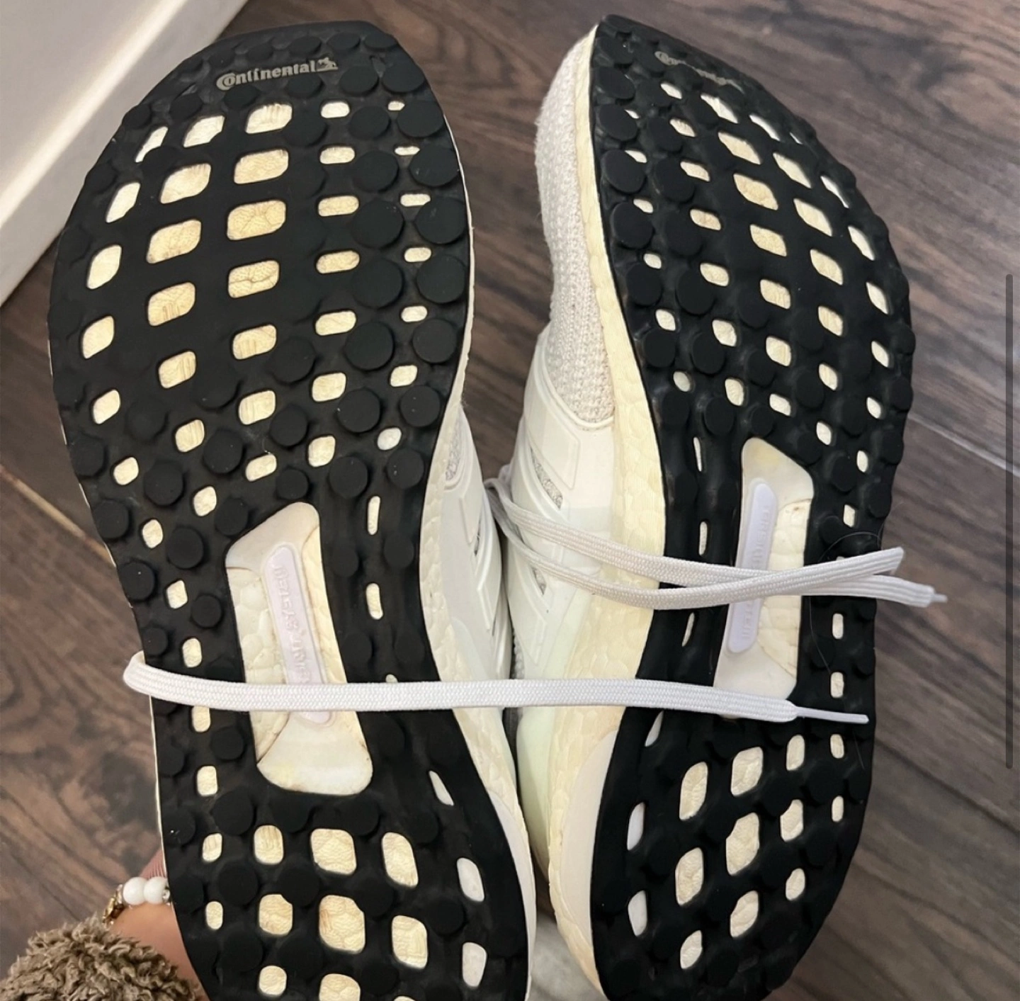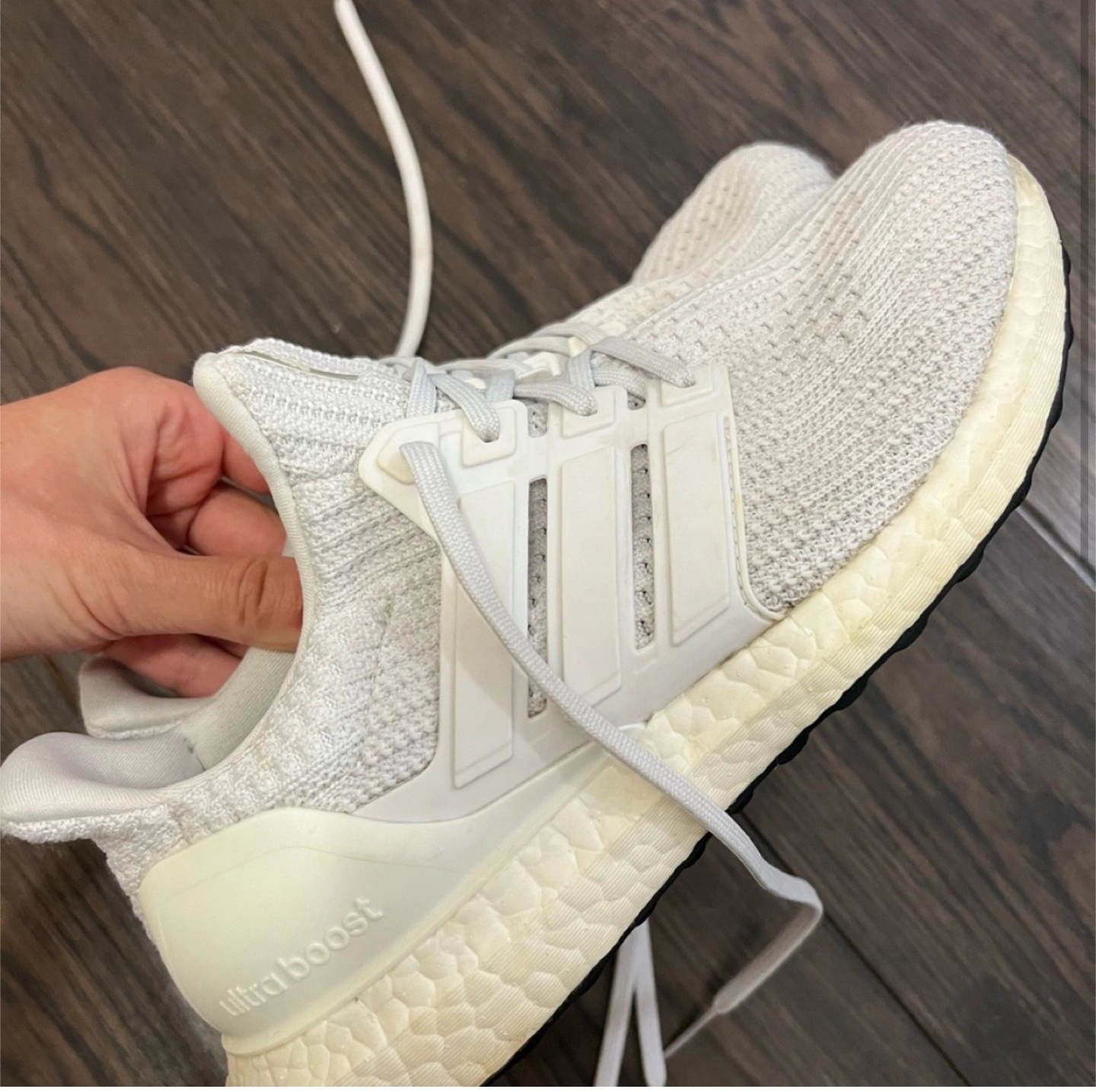 Selling a pair of Adidas Ultraboost sneakers in all white! They're made with Primeblue, a high-performance recycled material made in part with Parley Ocean Plastic