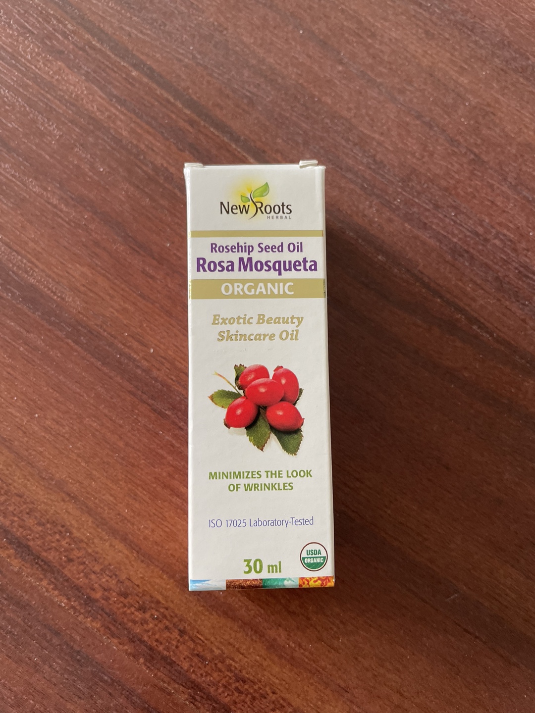 Sealed New Roots Rosehip Seed Oil Rosa Mosqueta organic exotic beauty skincare oil. It's 30 ml and minimizes the look of wrinkles.