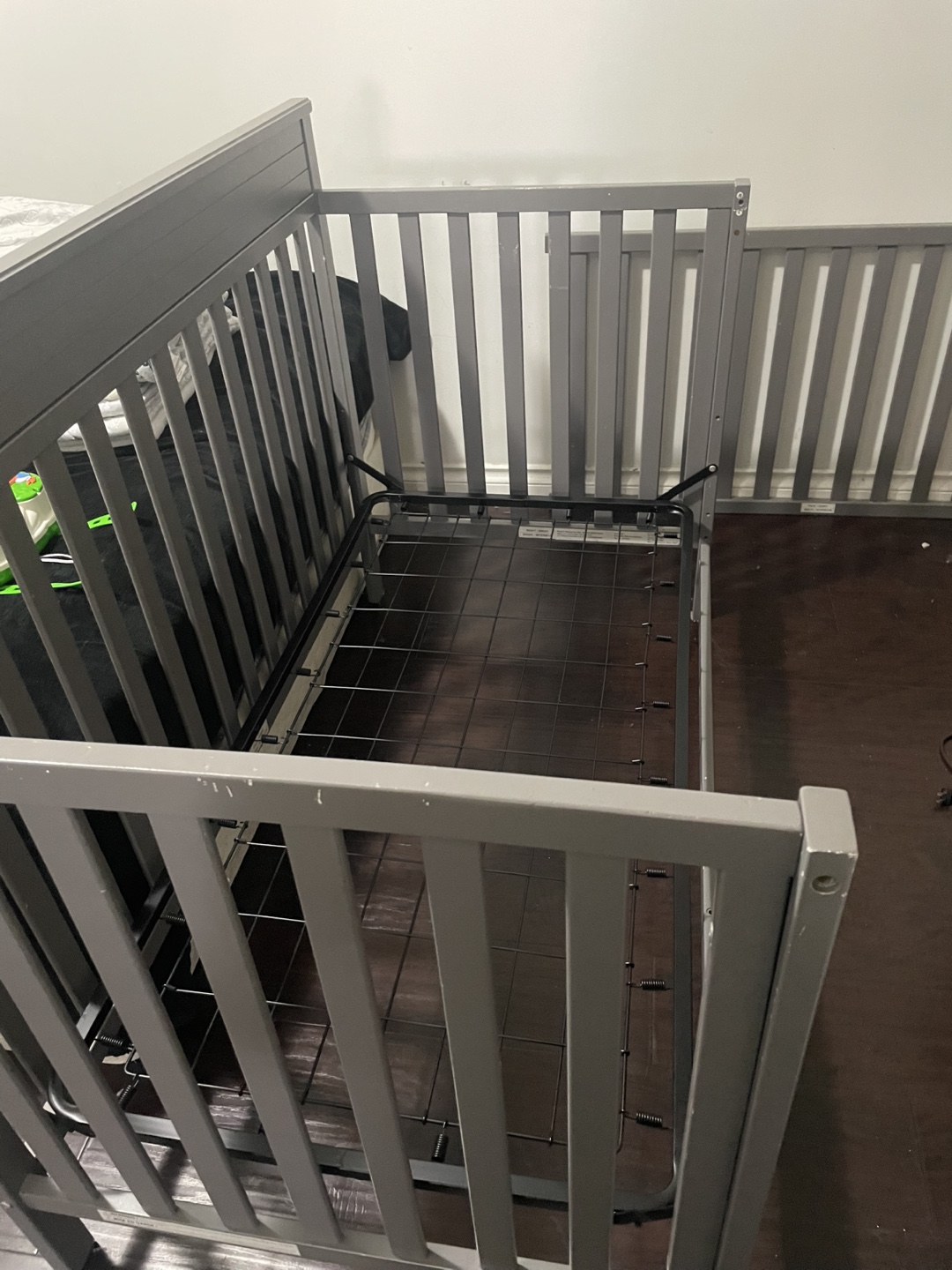 Grey crib and mattress. Suitable for infants. Mattress features organic cotton. Jungle sheet, bed skirt & bed wet sheet cover. Some minor wear and tear.
