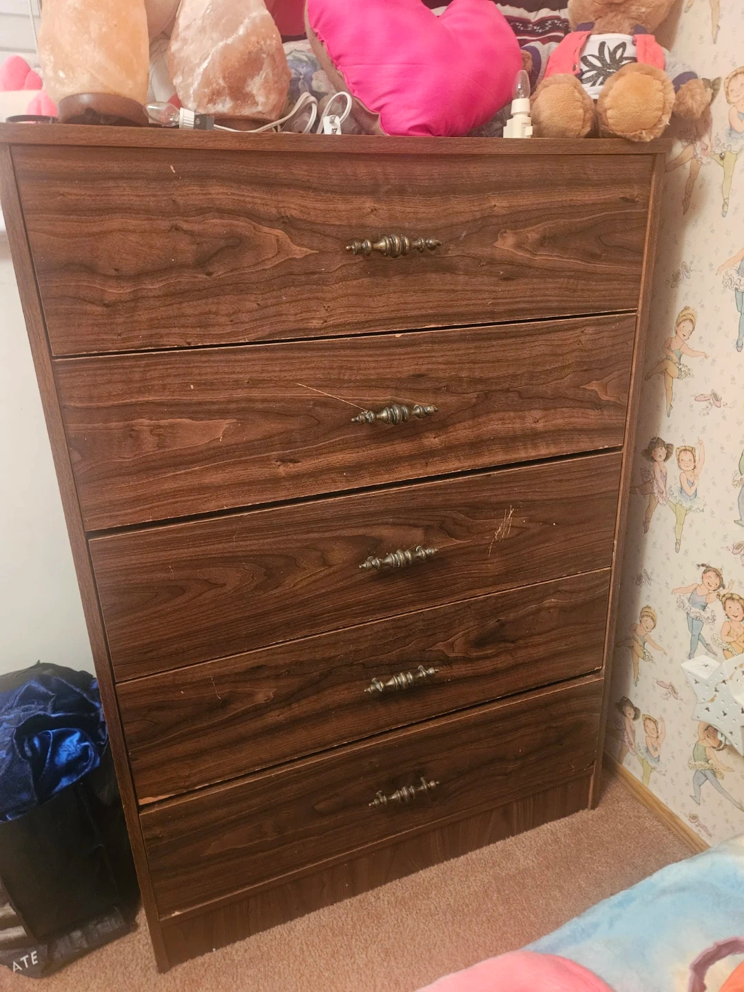 This is a 5-drawer dresser with a dark wood finish. It has vintage-style metal handles. This dresser offers good storage space for your bedroom.