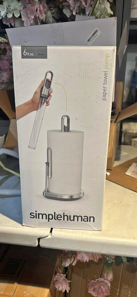 Brand new Simplehuman paper towel pump. Has a pump mechanism for dispensing paper towels. Comes with a clear refill container and a stainless steel base. Ergonomically designed pump for continuous fine mist.