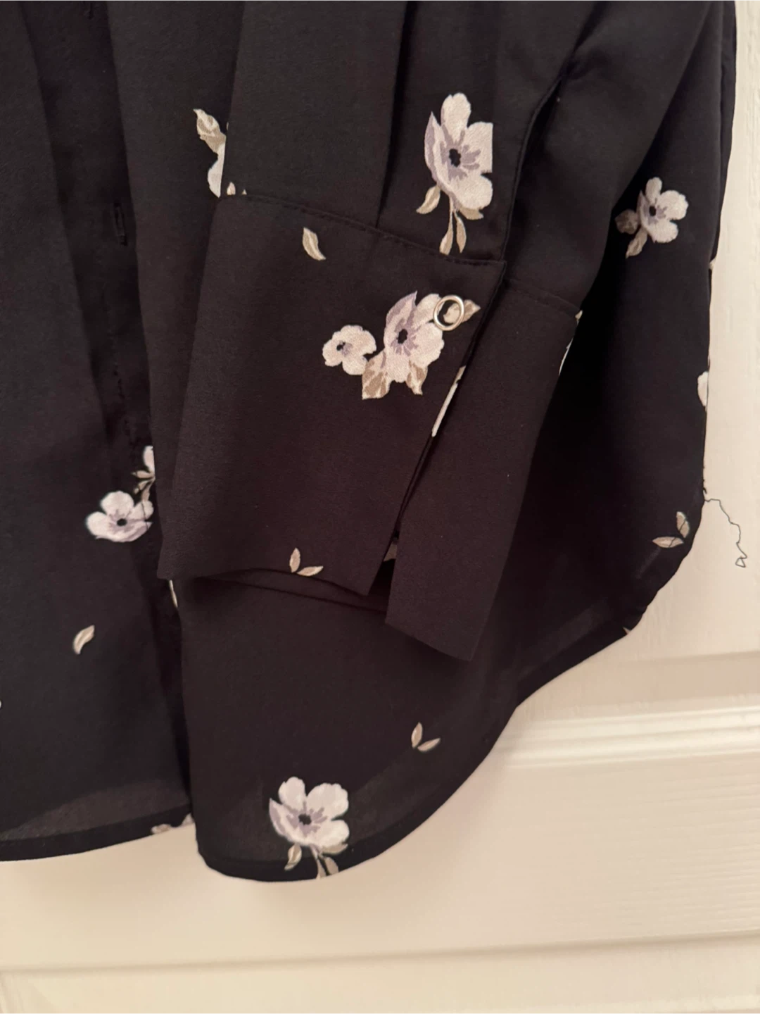 A cute button-down shirt with a floral print and a ring detal in the back! It's black with small white flowers all over. Perfect for dressing up or down