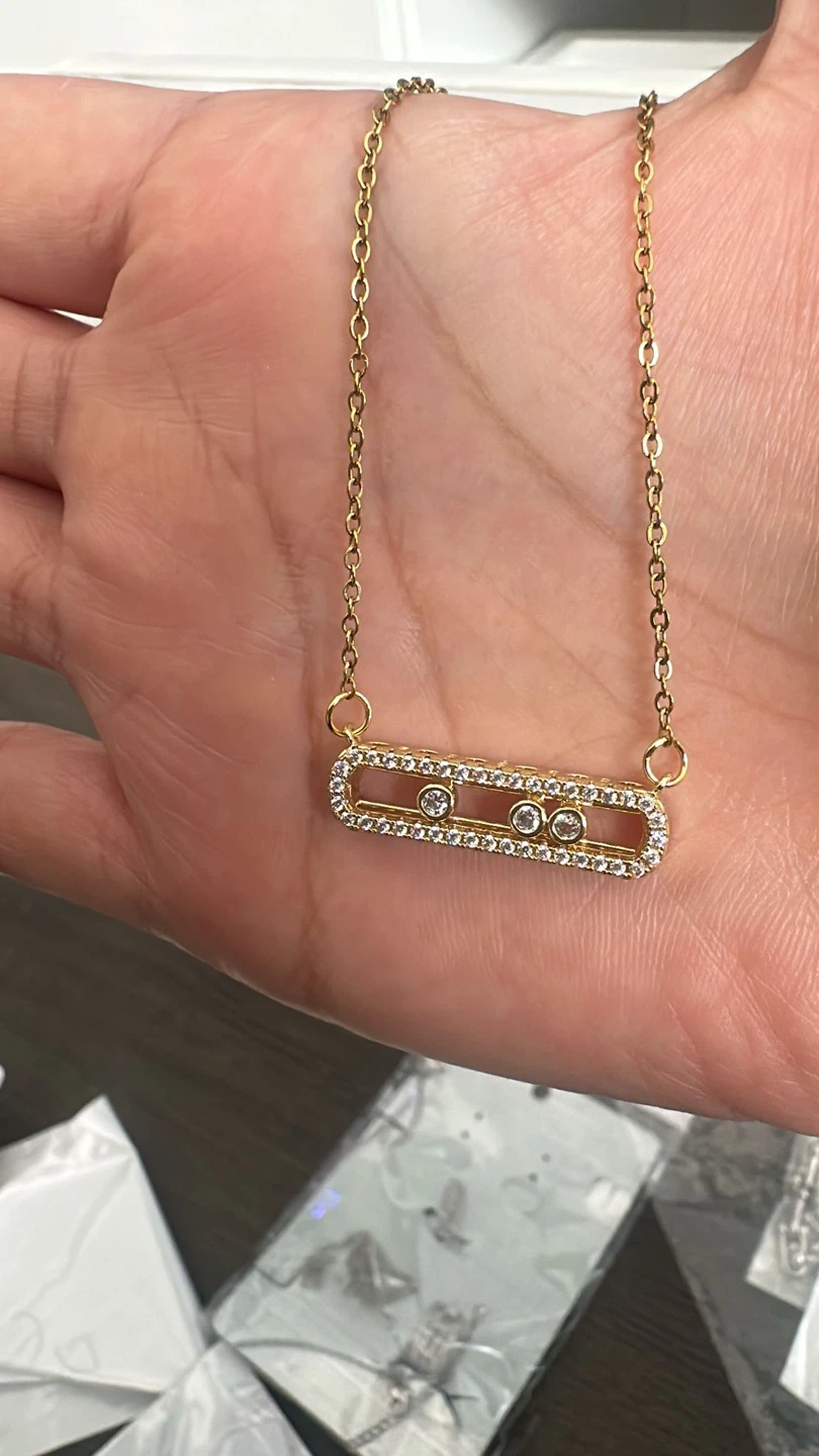 This is a gold- plated tone necklace featuring a rectangular pendant adorned with cubic zirconia stones. It has three stones inside the pendant. Perfect for adding a touch of sparkle to any outfit! Stainless steel daily use