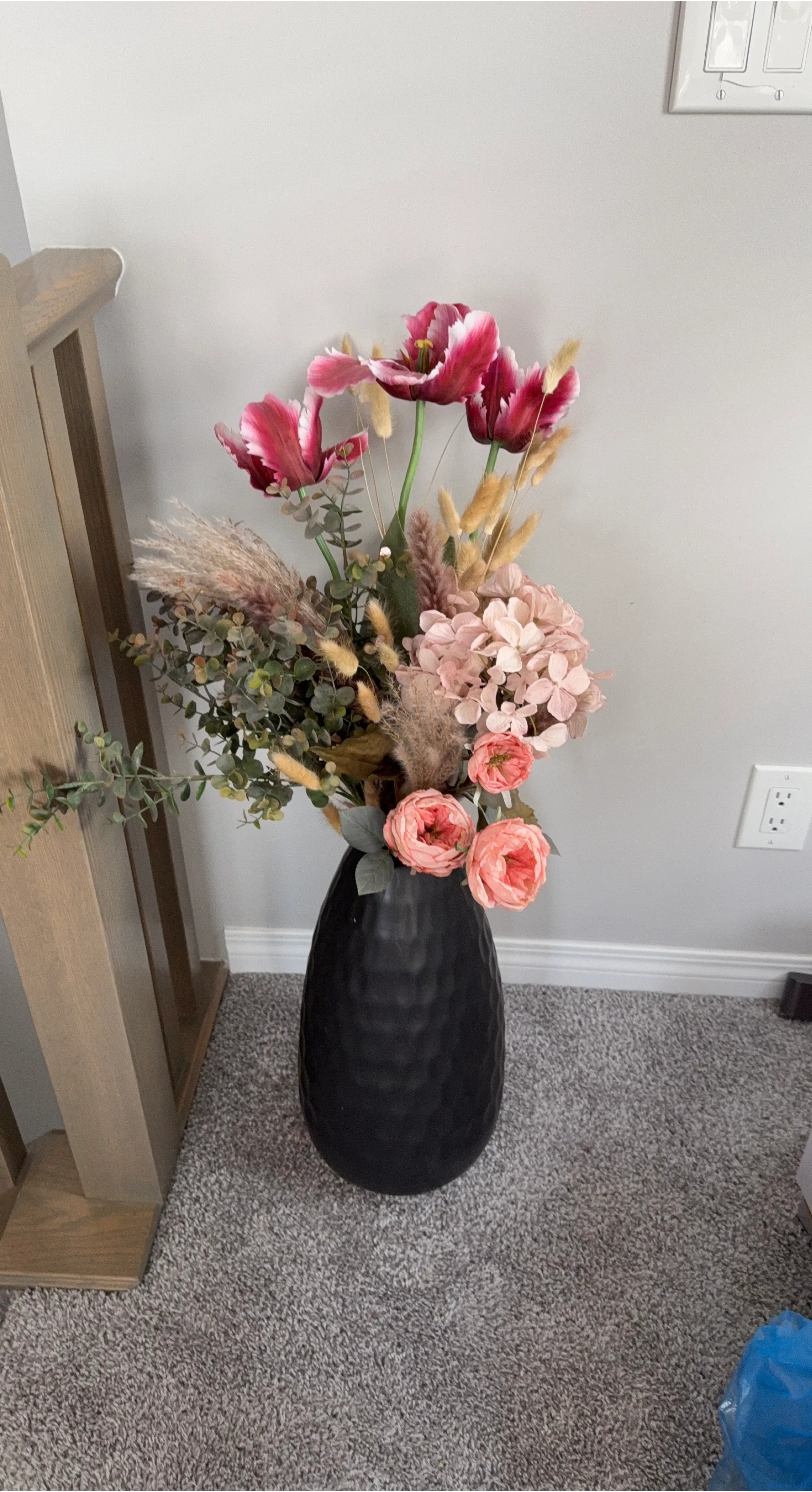 This artificial flower arrangement features vibrant pink tulips, soft pink hydrangeas, and natural-looking greenery. It's housed in a textured black vase. The arrangement brings a touch of lasting beauty to any space without the need for watering. This decorative piece is perfect for adding colour and life to a room.