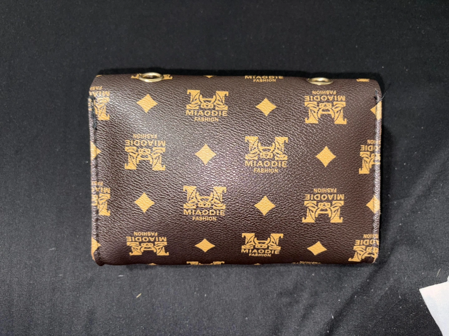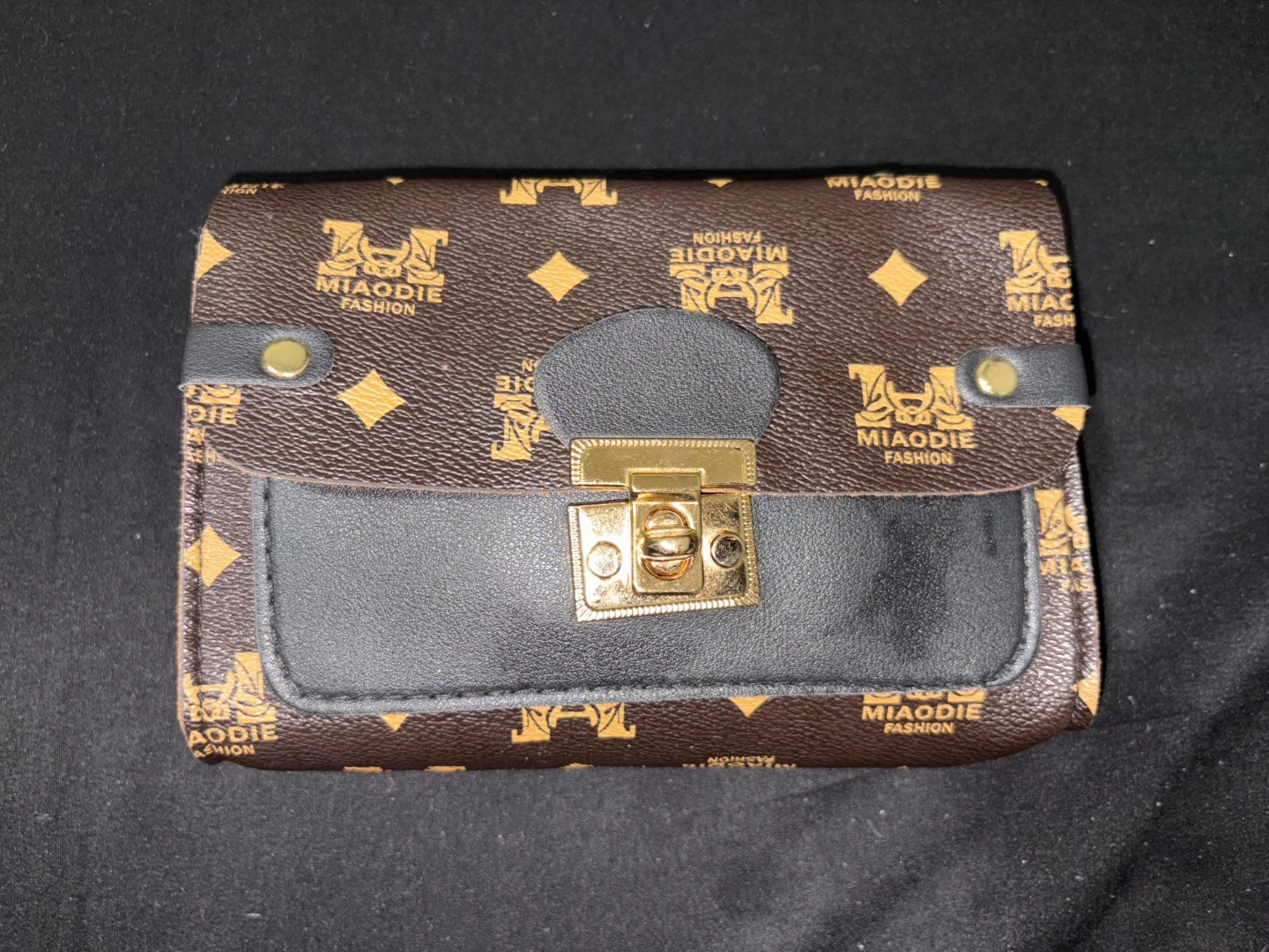 This is a Miaodie Fashion wallet in a brown monogram print. It features a faux leather material with a gold clasp closure. It's a compact size for essentials.