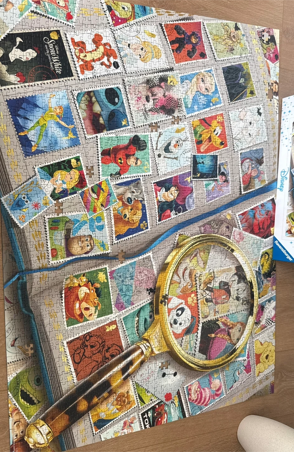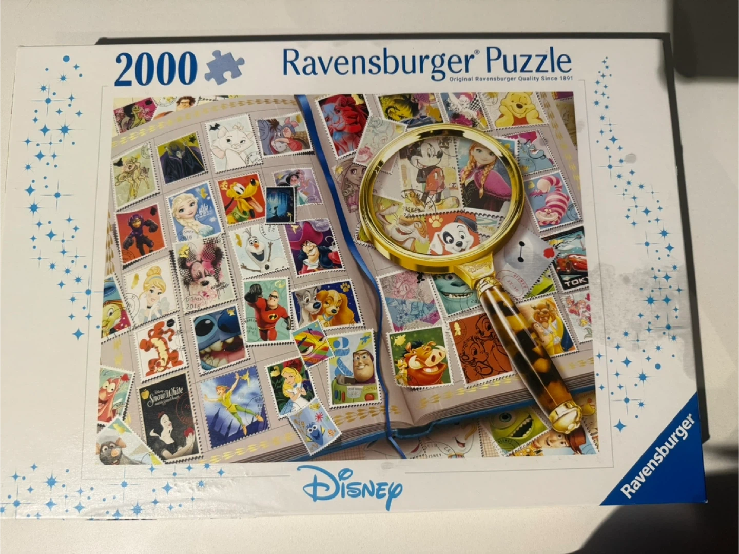 Ravensburger 2000 piece puzzle featuring Disney characters depicted as postage stamps. Includes the original box. It's a fun challenge for Disney fans!
