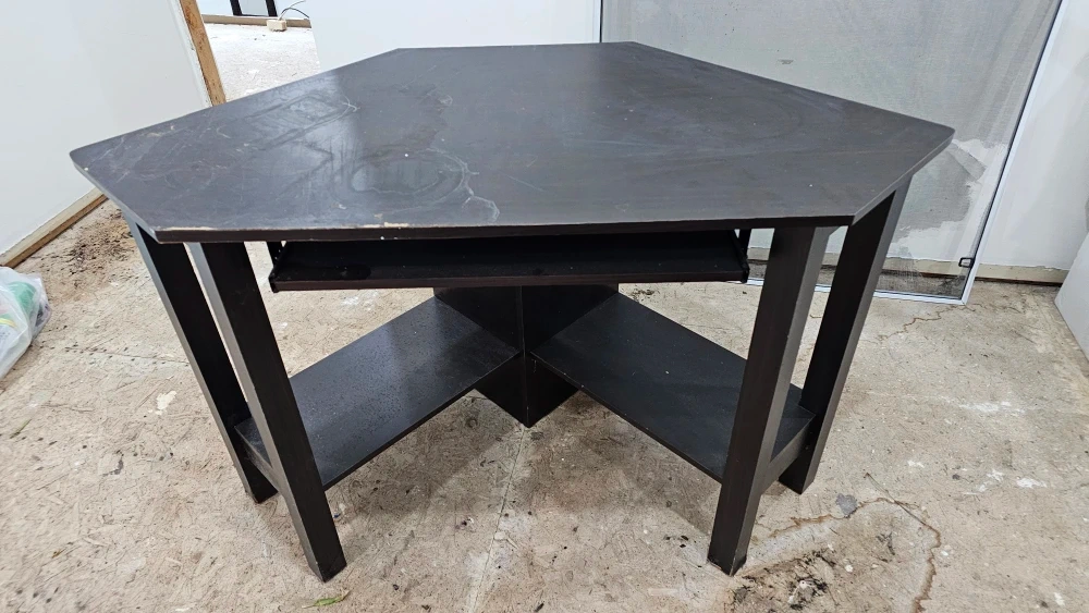 Corner desk in dark brown. It has a unique hexagonal shape and a shelf underneath. Perfect for a small space or a student's room!