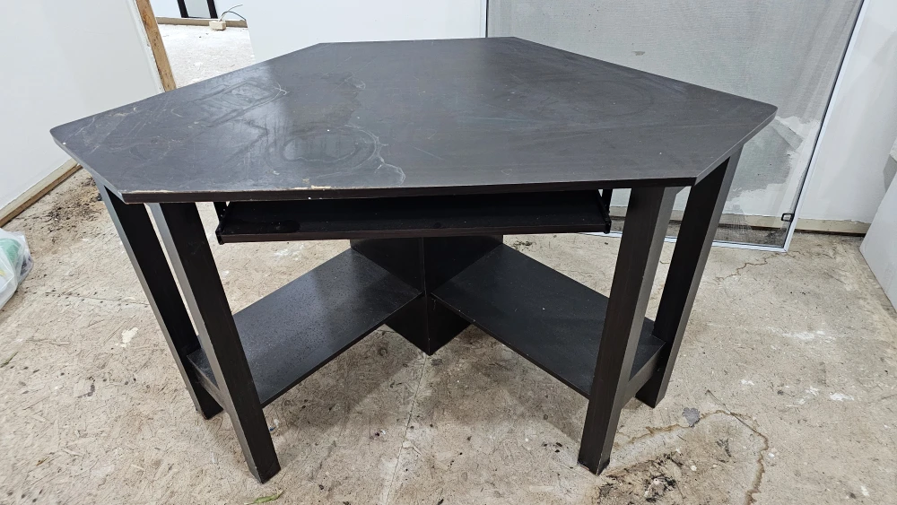 Corner desk in dark brown. It has a unique hexagonal shape and a shelf underneath. Perfect for a small space or a student's room!