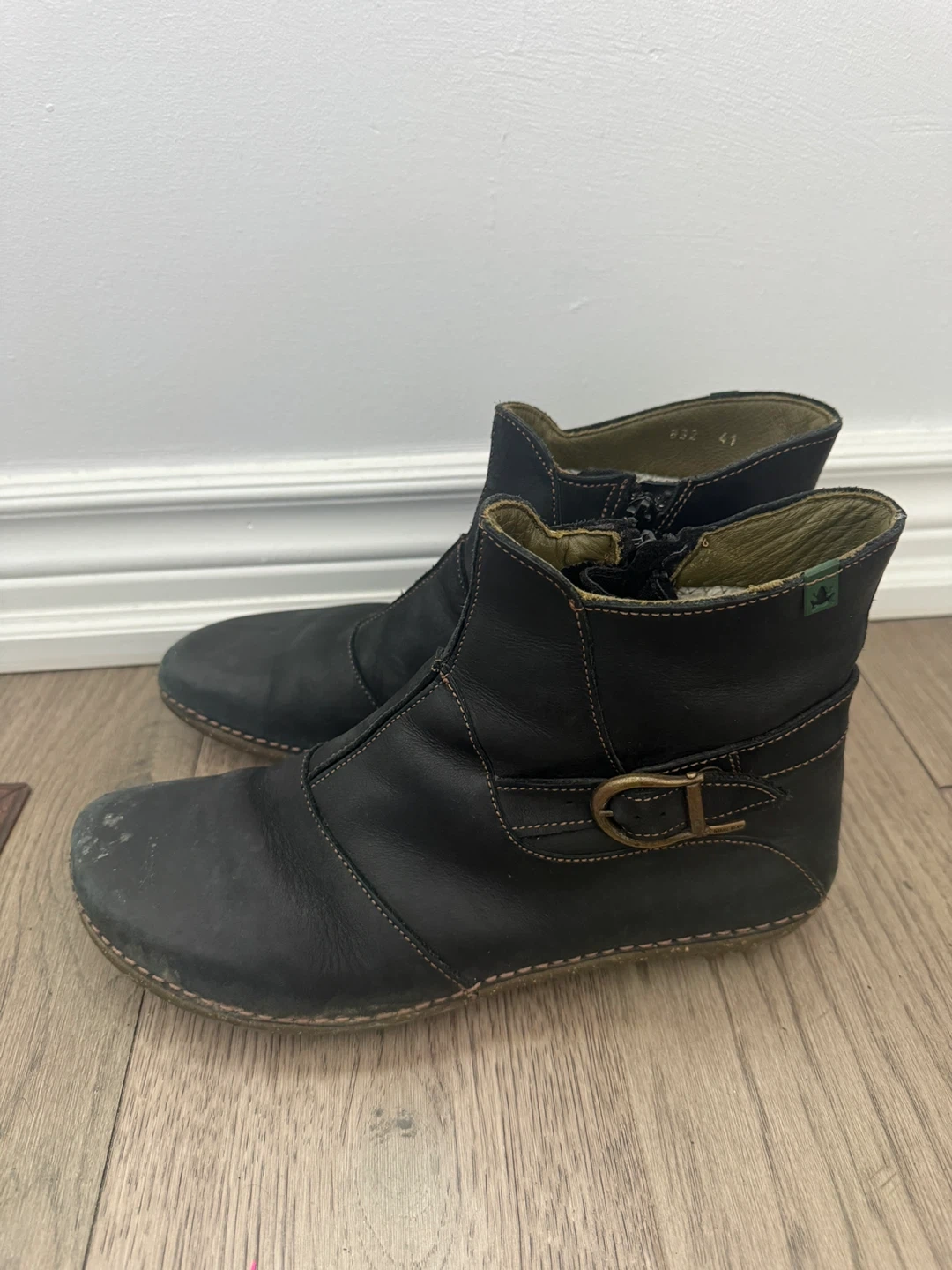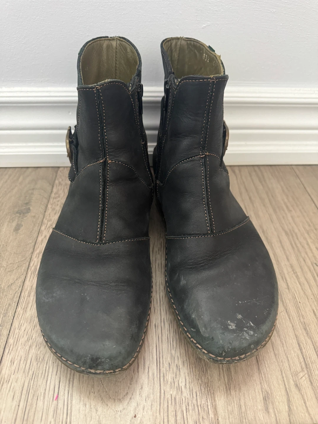 Josef Seibel women's black leather ankle boots. These boots feature a side zipper closure and a decorative buckle. Size 41.