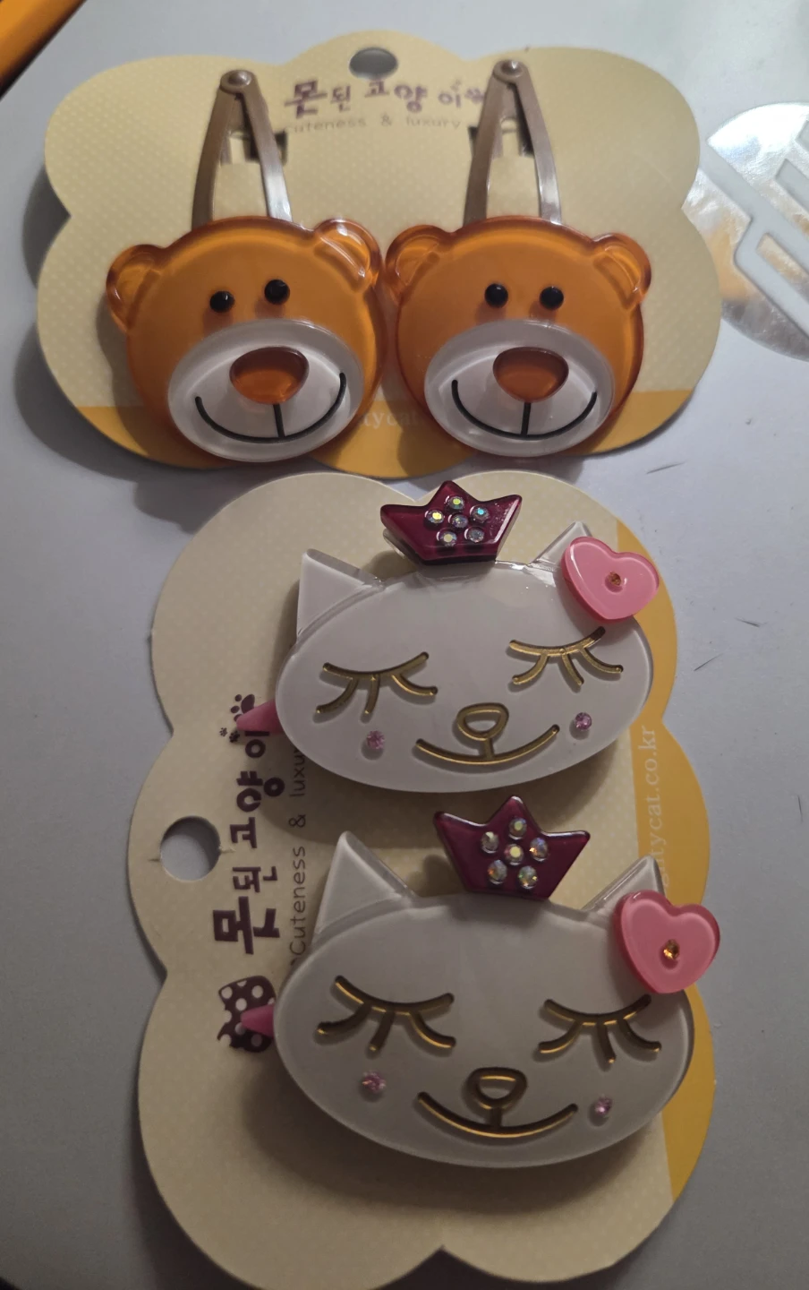 Cute bear and cat face hair clips to add a fun touch. Includes two orange bear clips and two grey cat clips with pink hearts. They're perfect for adding a little flair to hairstyles! Brand new.