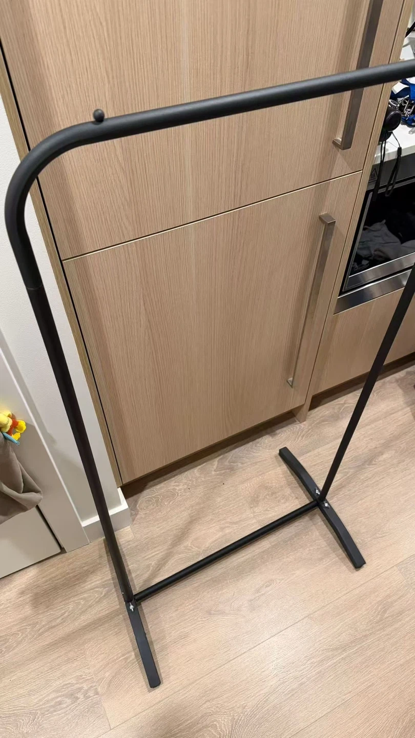 A simple black metal garment rack with a sturdy base. It's great for organizing clothes or displaying items. The minimalist design fits well in many spaces.