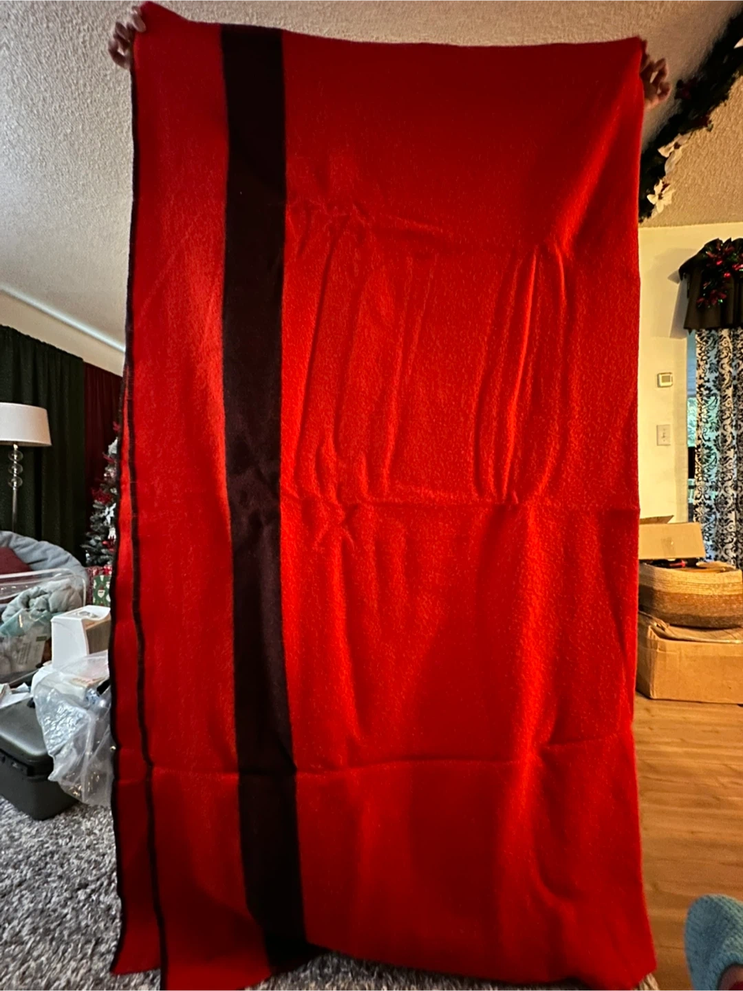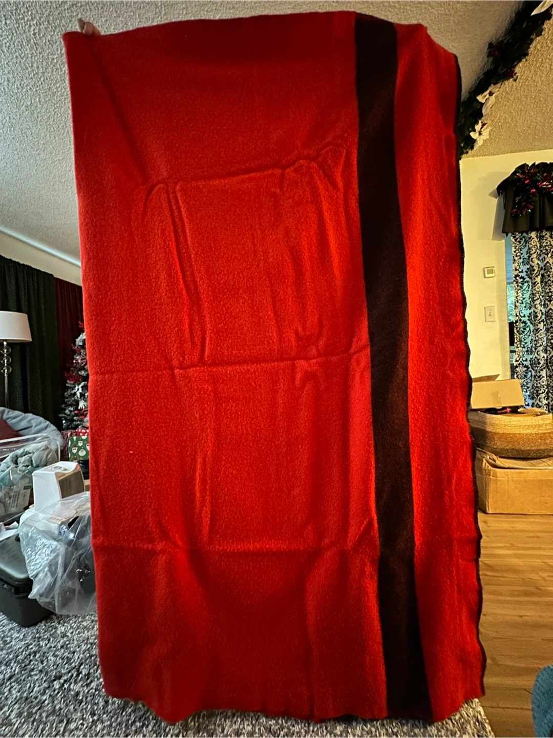 Selling a lovely Ayers Pioneer pure wool blanket! It's a vibrant red colour with a dark brown stripe. This Canadian product is in good condition and ready to keep you cozy. It was a gift but never used. Just in storage for years.