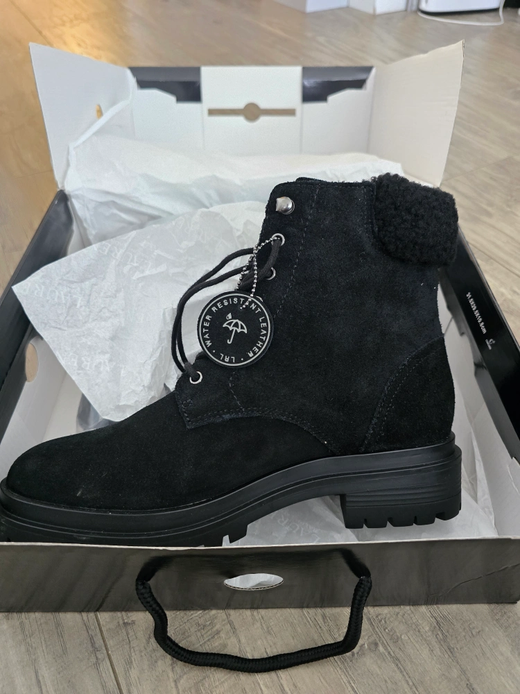 New women's black suede ankle boots. Water-resistant leather. Lace-up style. Shearling lining. Comes in original box.