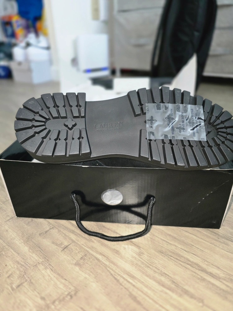 New women's black suede ankle boots. Water-resistant leather. Lace-up style. Shearling lining. Comes in original box.