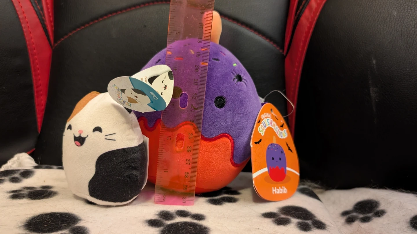 This is Habib, the cupcake Squishmallow. It's a plush toy featuring a purple cupcake design with orange frosting and sprinkles. Also includes a small calico cat plush. Great for collectors!