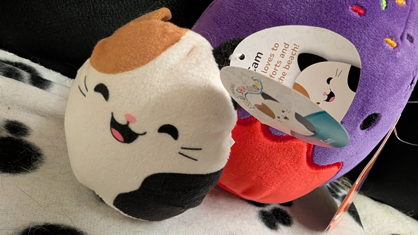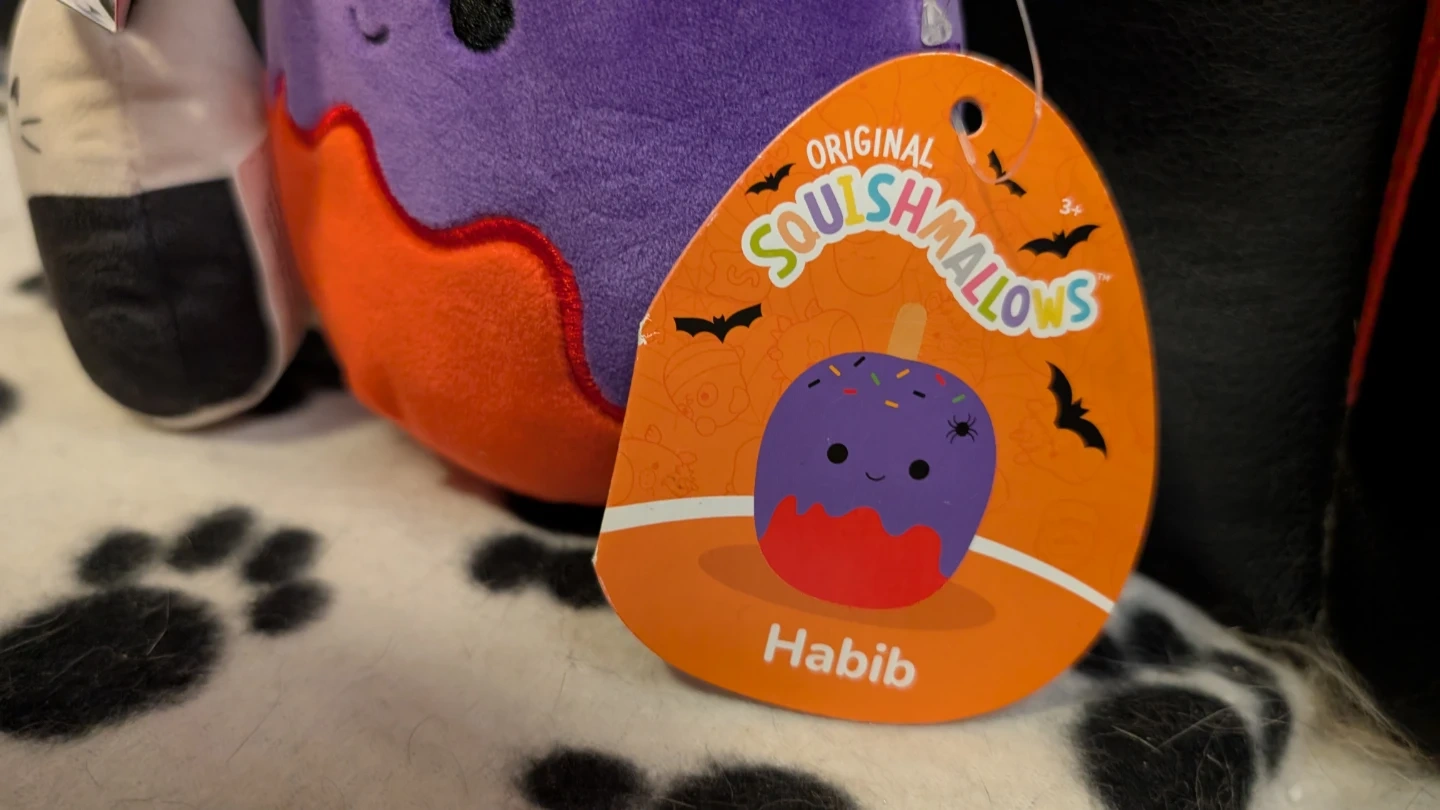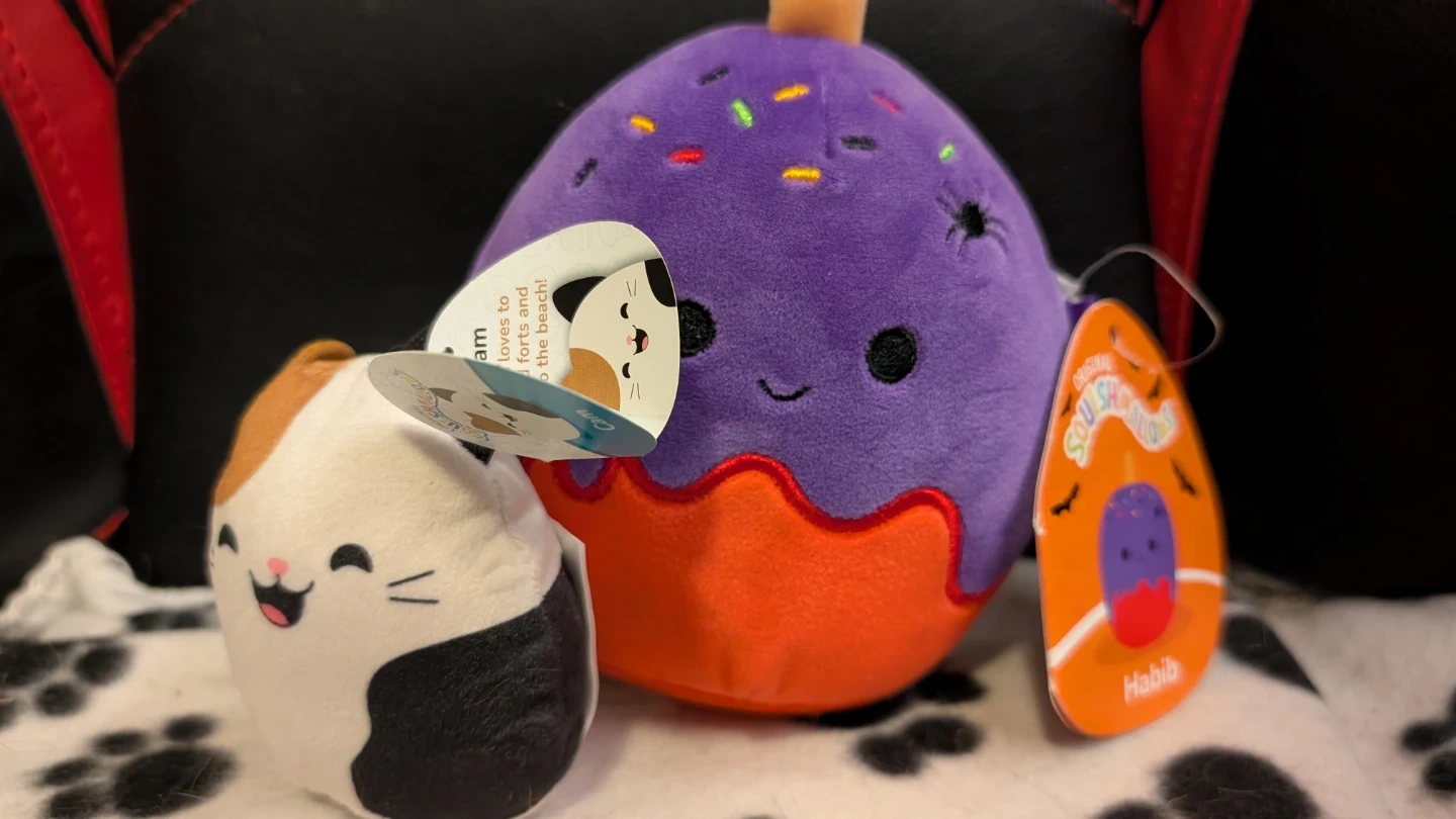 This is Habib, the cupcake Squishmallow. It's a plush toy featuring a purple cupcake design with orange frosting and sprinkles. Also includes a small calico cat plush. Great for collectors!