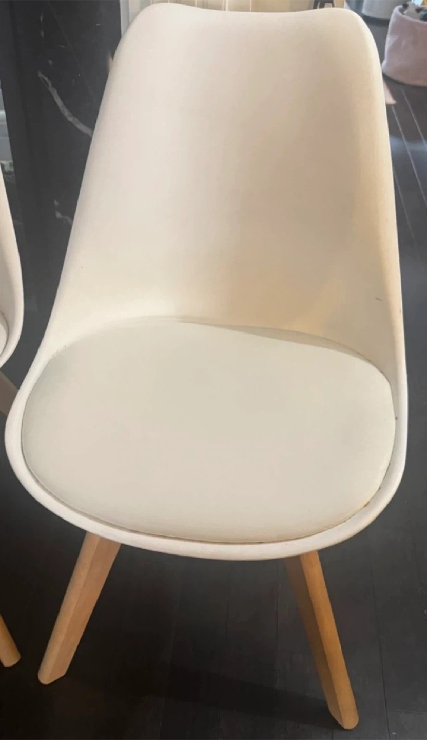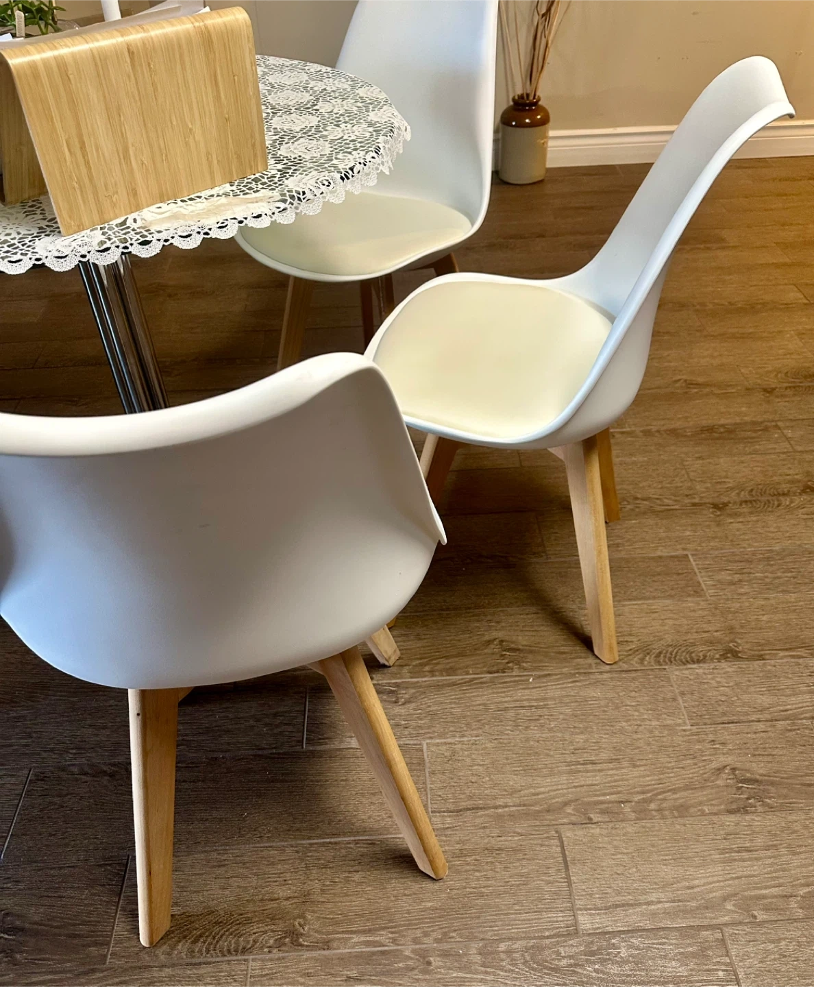Selling a set of three white dining chairs. These chairs feature molded plastic seats with a light cream-coloured cushion. They have natural wood dowel legs. They're stylish and comfortable for any dining area.