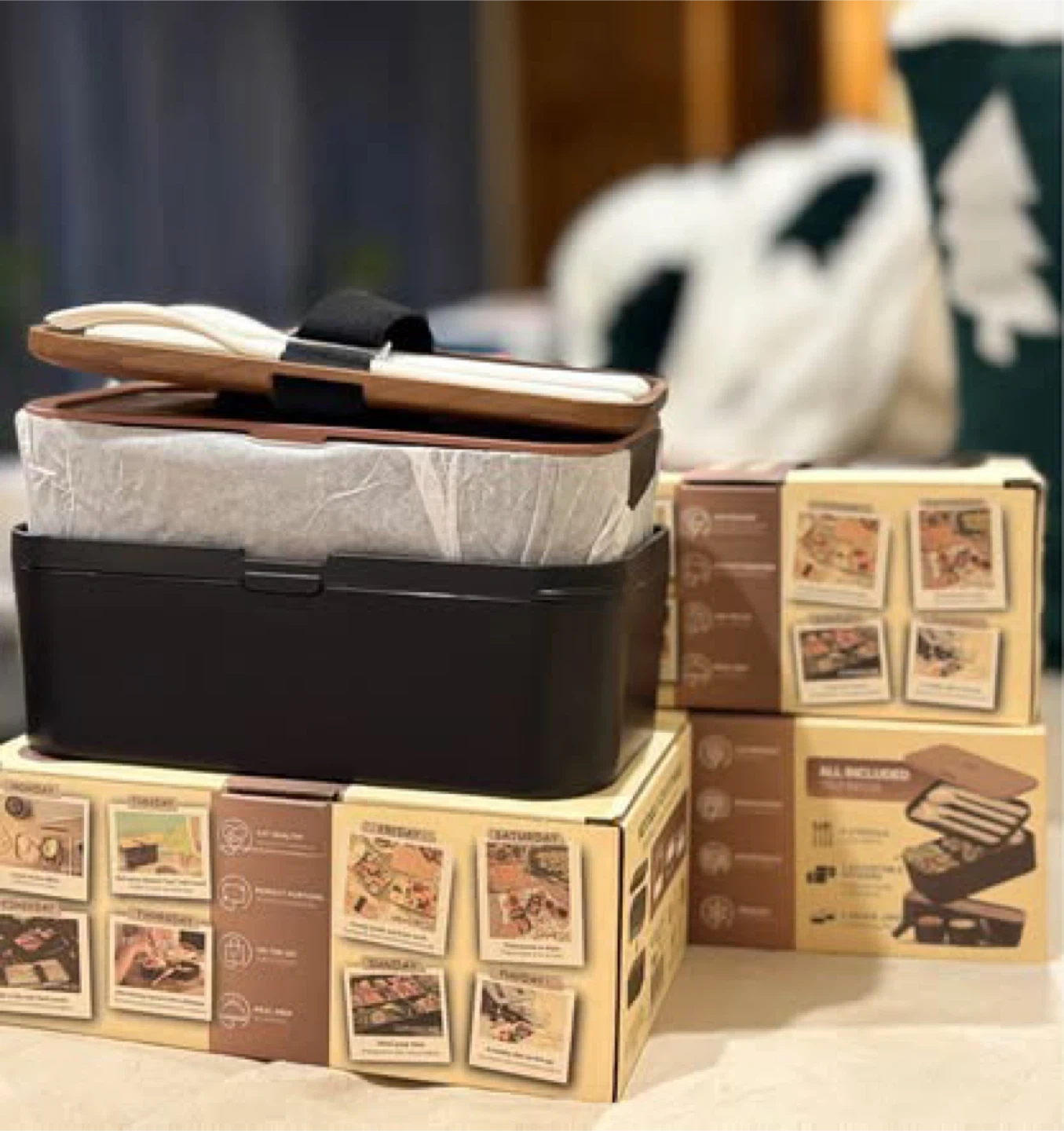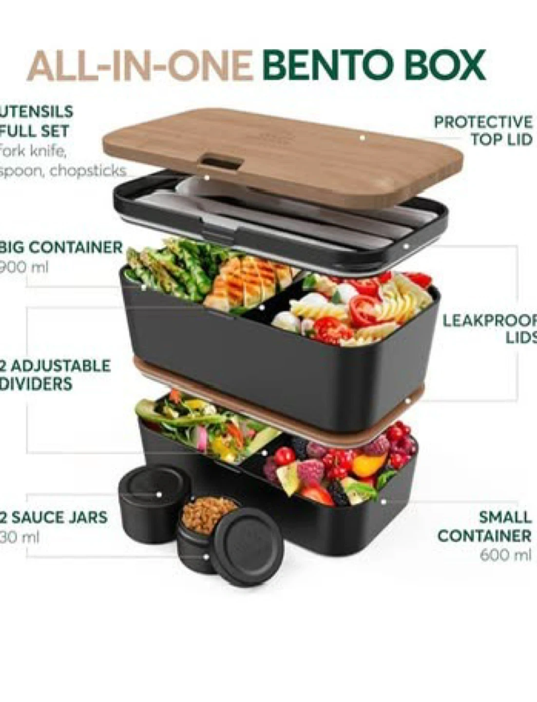 This Umami bento box is black with a walnut wood lid and comes with utensils, 2 dividers, and 2 sauce jars. It's leakproof, dishwasher, microwave, and freezer safe. The big container is 900ml and the small container is 600ml.