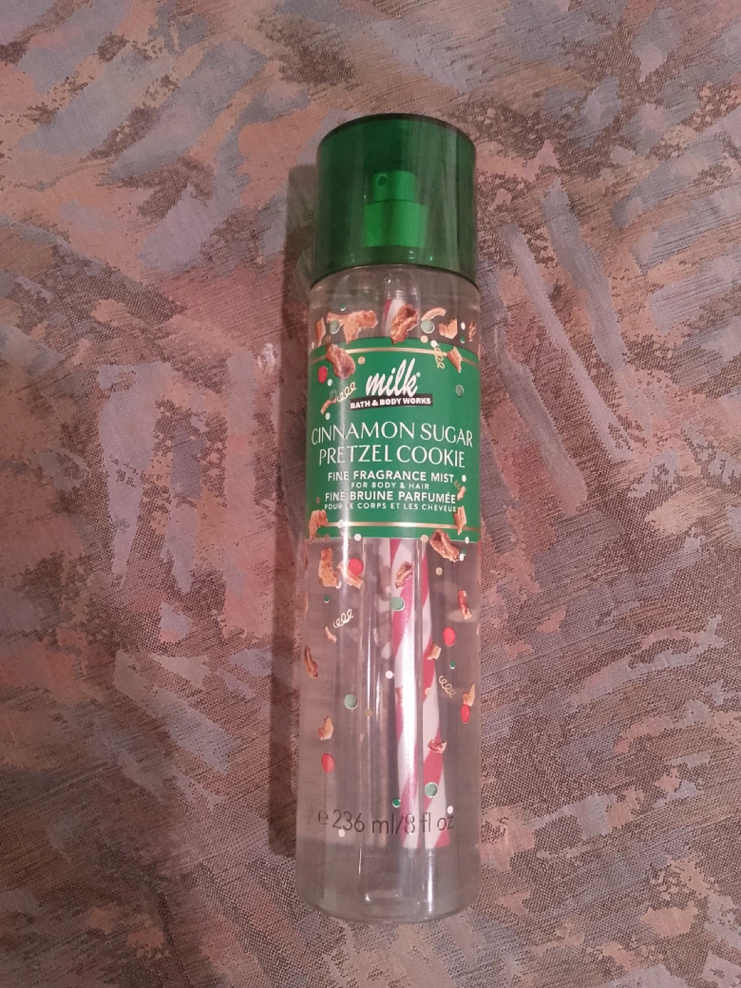 This is a Bath & Body Works fine fragrance mist. It's the Cinnamon Sugar Pretzel Cookie scent for body and hair. The bottle is 236 ml or 8 fl oz.