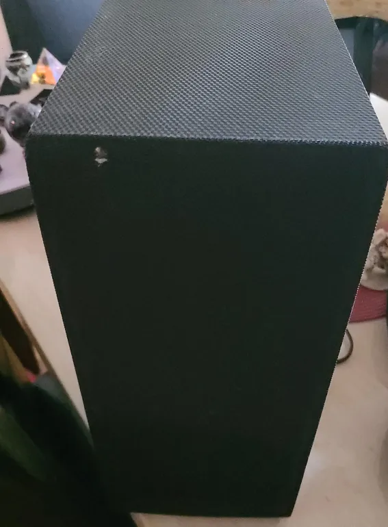A tall, black speaker. The top has a unique textured pattern. Perfect for enhancing your listening experience in a soothing way.