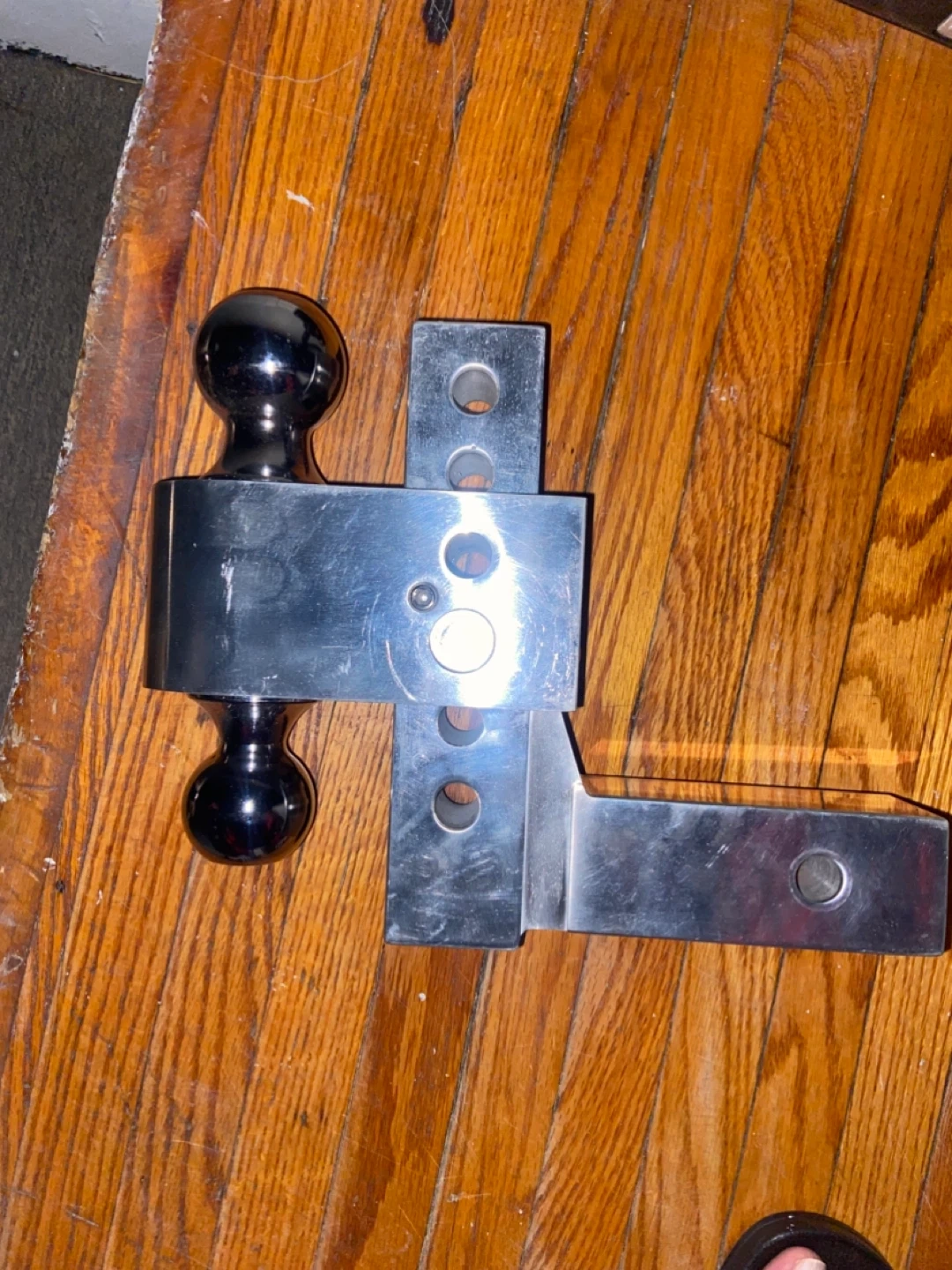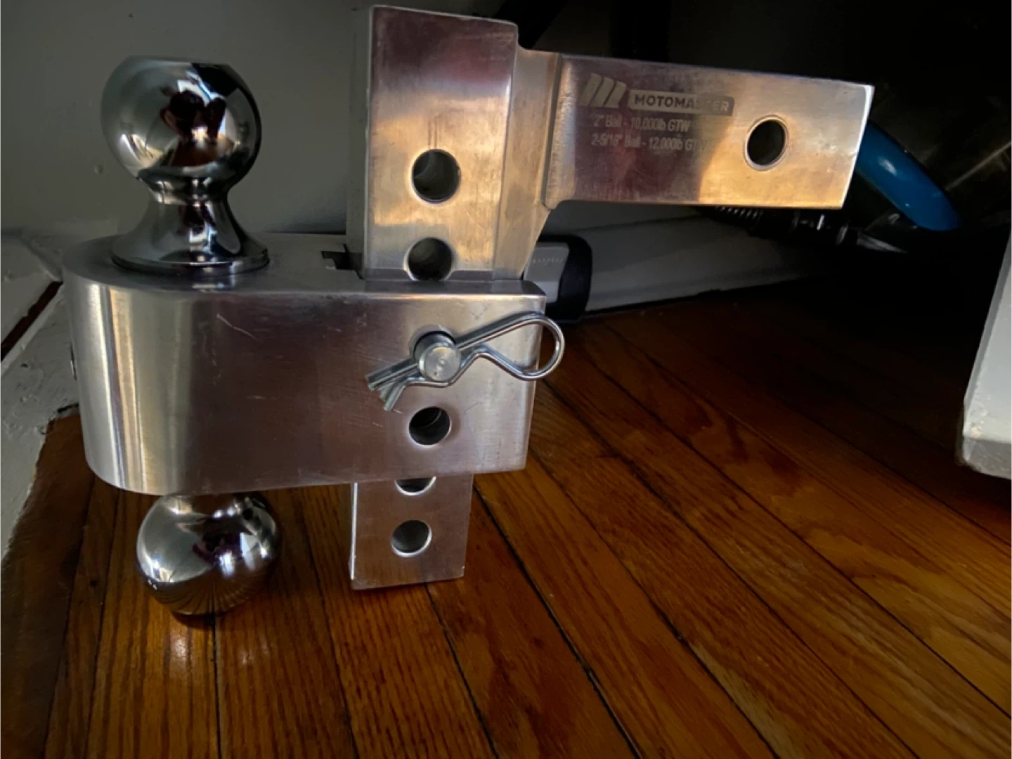 This is a Motomaster hitch ball mount. It's made of metal with a chrome finish on the balls. It has a 2" receiver size and a 10,000lb GTW rating, with a 2,000lb TW rating.