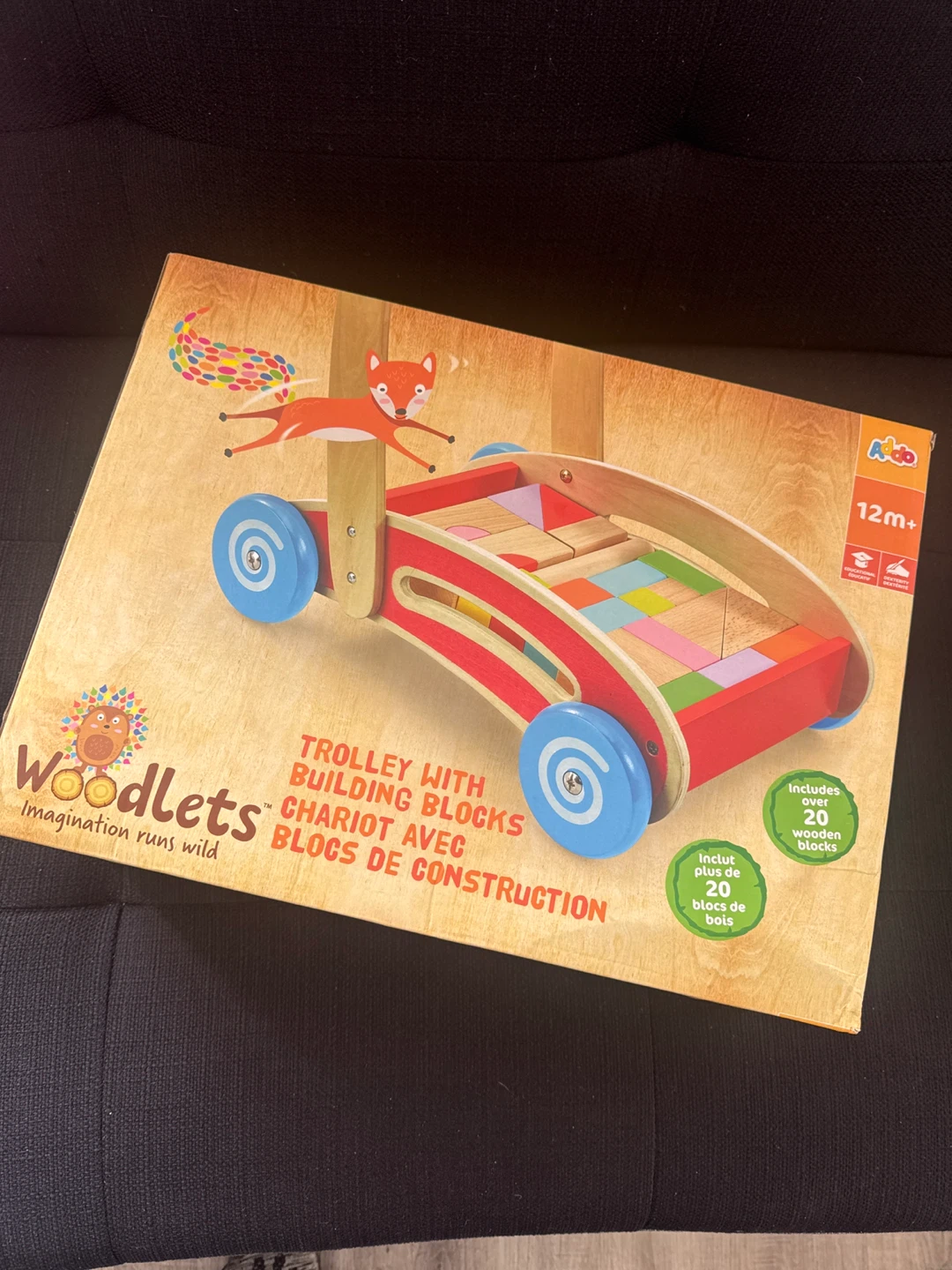 This Woodlets trolley comes with over 20 wooden building blocks. It's recommended for ages 12 months and up. Great for little ones learning to stack and push!