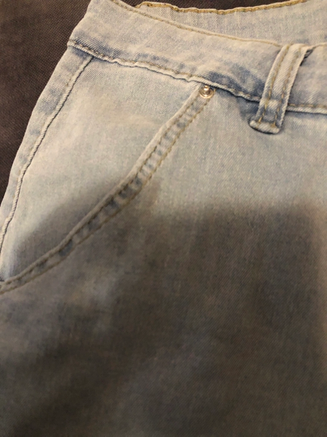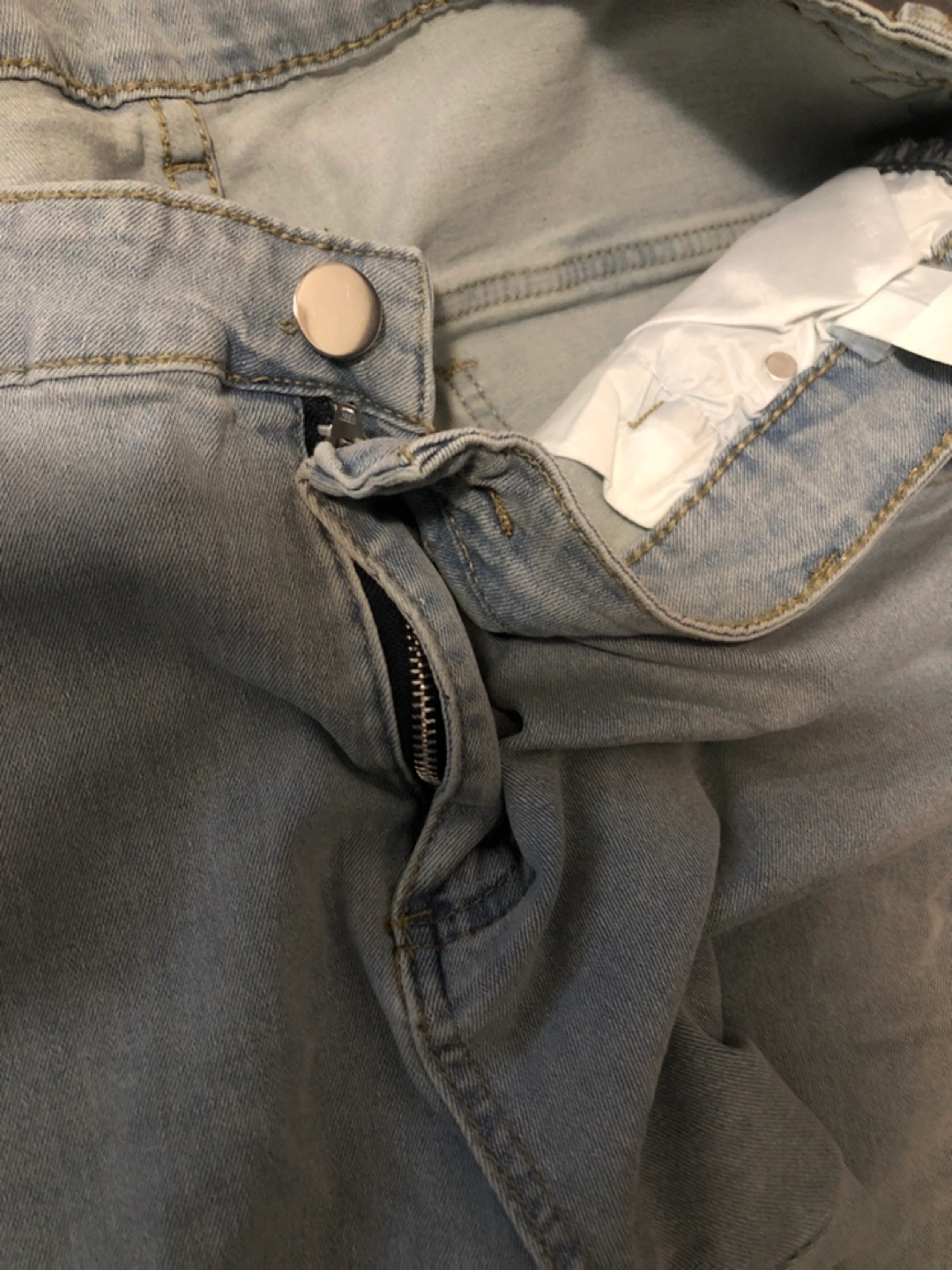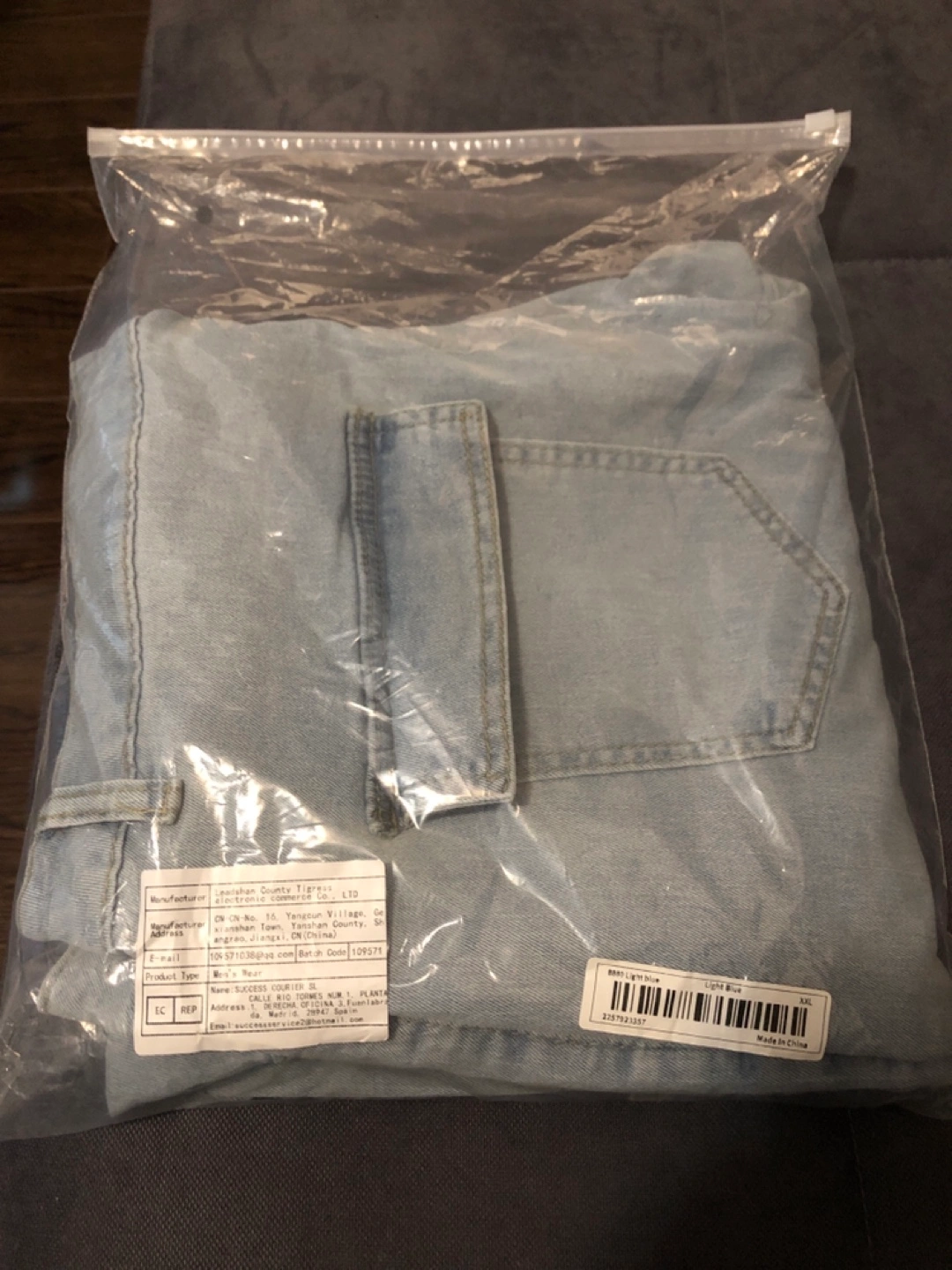 Light wash denim cargo jeans. Size XXL. 70% cotton, 25% polyester, 5% viscose, 2% spandex. Made in China. Features multiple pockets and a zipper fly.