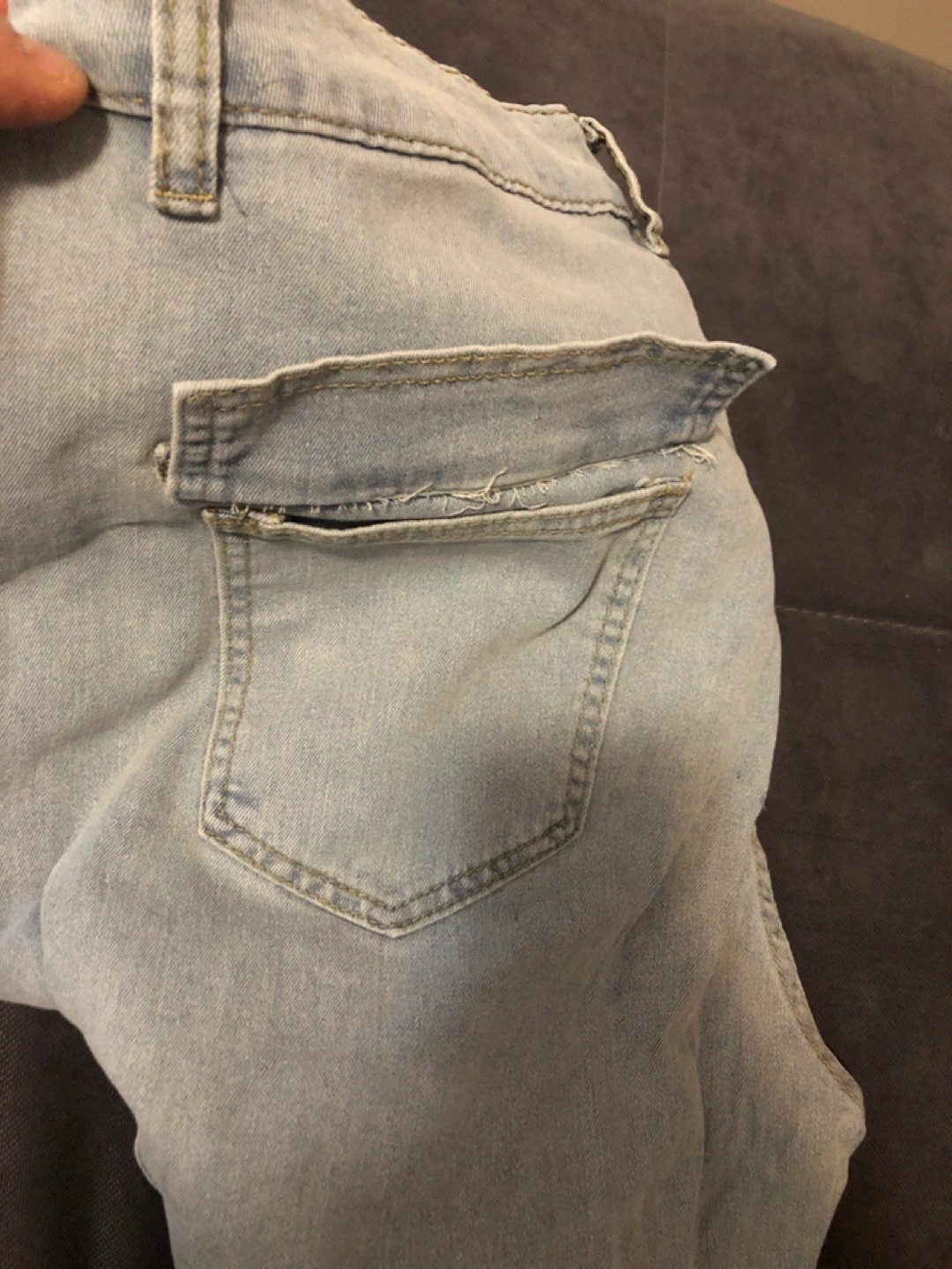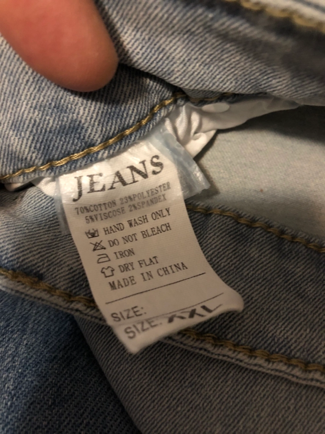 Light wash denim cargo jeans. Size XXL. 70% cotton, 25% polyester, 5% viscose, 2% spandex. Made in China. Features multiple pockets and a zipper fly.
