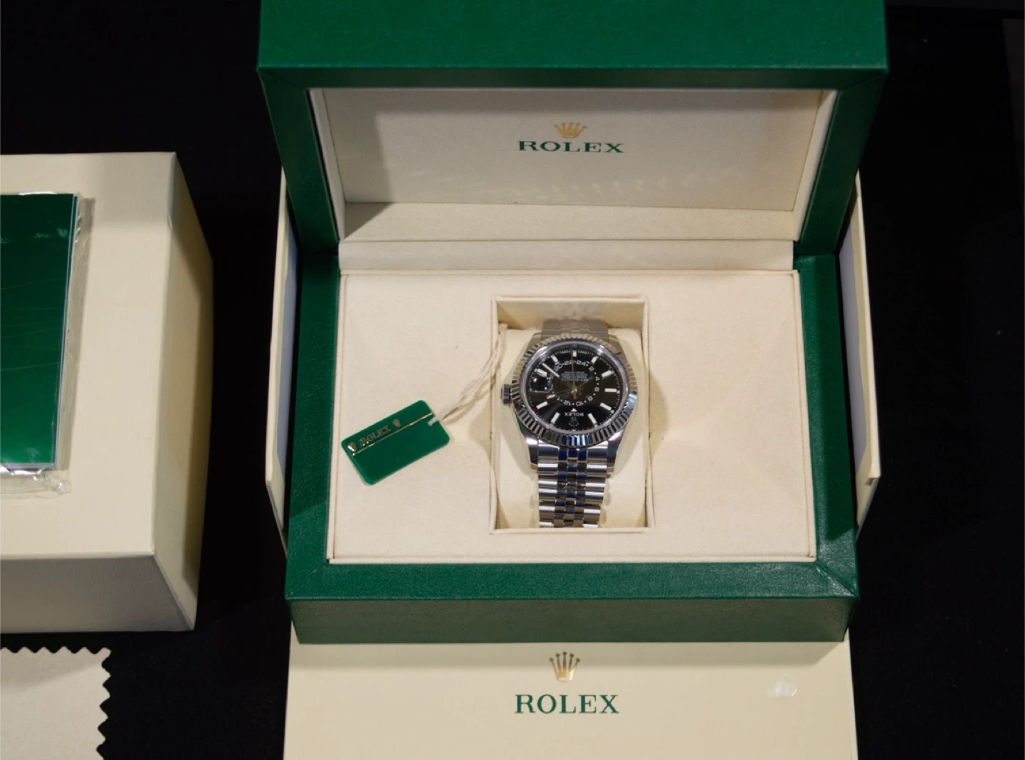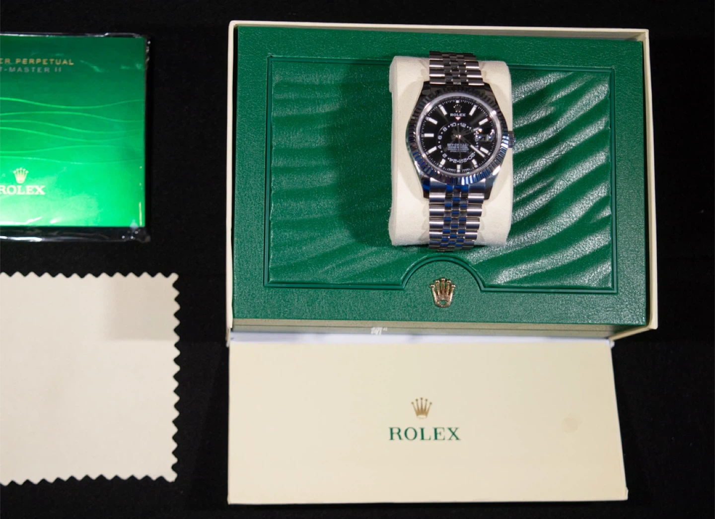 Selling a Rolex Oyster Perpetual GMT-Master II watch. It comes complete with the original box, warranty booklet, and polishing cloth. This timepiece features a stainless steel band and a black dial.
