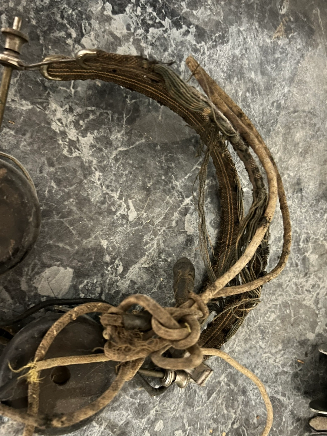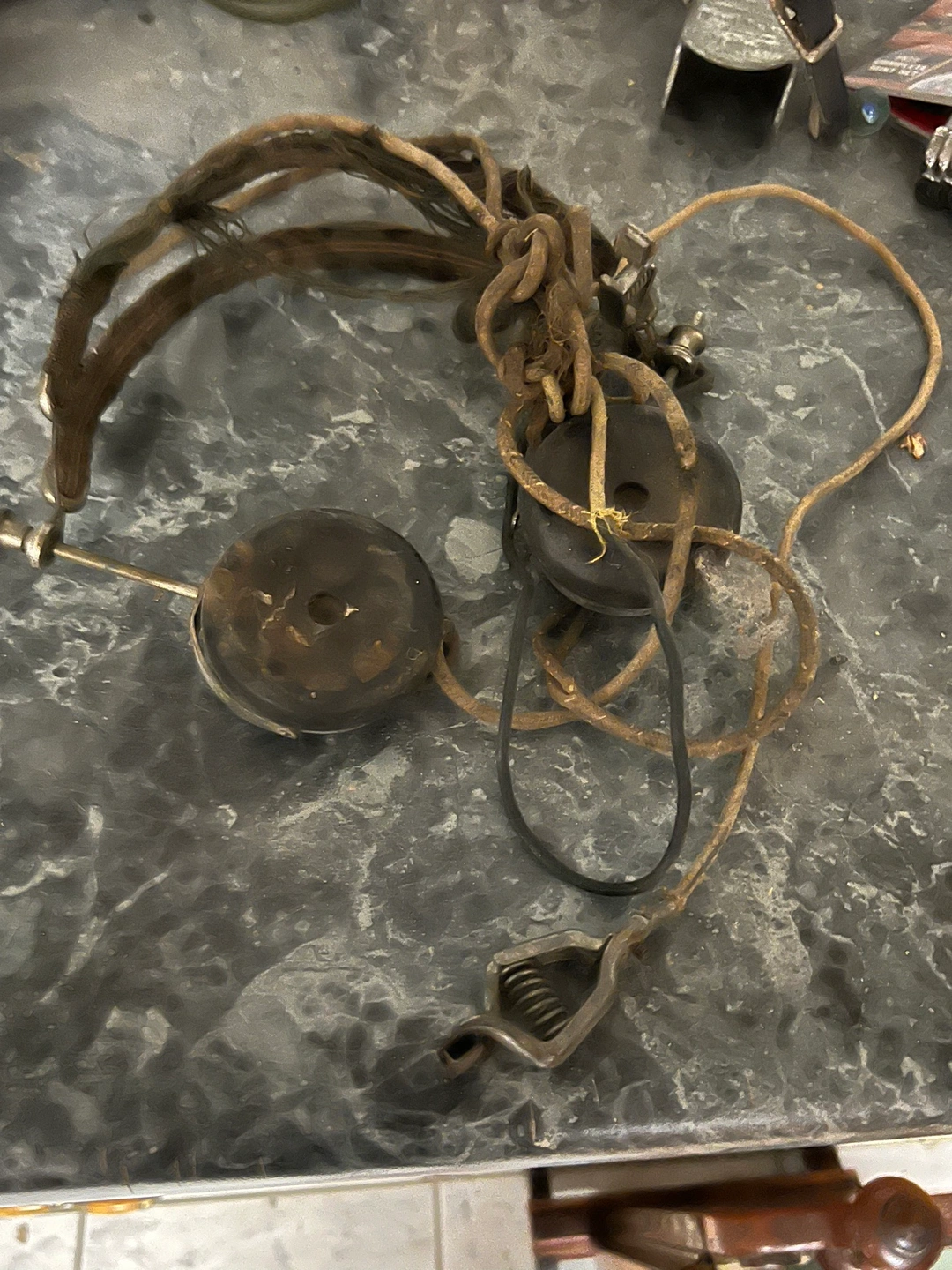 Vintage headset, possibly from WWI, but unsure of the exact year. Some damage to the headband but the ear muffs are in good condition, considering the age, and it has the plug for the switch board. Asking $60