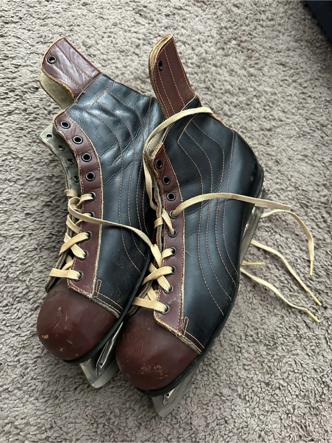 Selling a pair of vintage leather ice skates. They show some wear and tear, but still have a lot of character! Perfect for a collector or someone looking for a classic pair of skates.