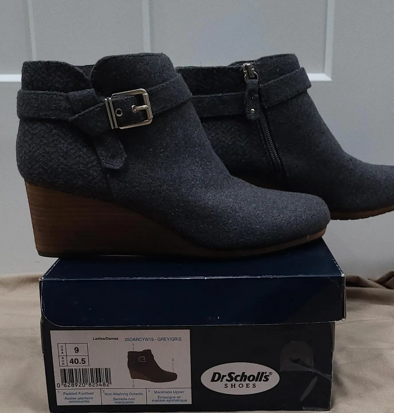 Selling a pair of Dr. Scholl's Darcy ankle boots in grey! These are a size 9 and come with the original box. They feature a padded footbed and a man-made upper for comfort and durability. The outsole is non-marking, making them great for indoor wear too