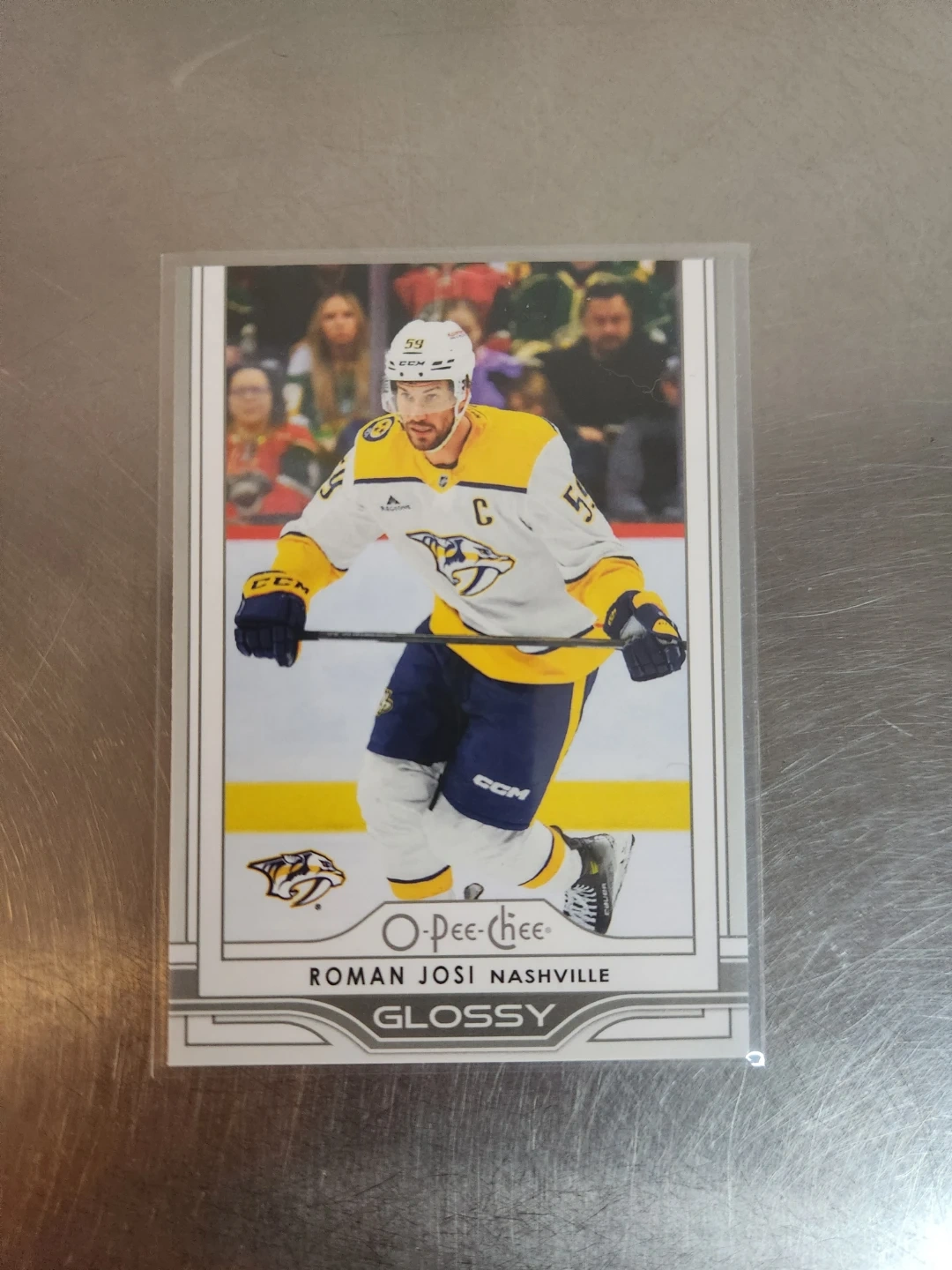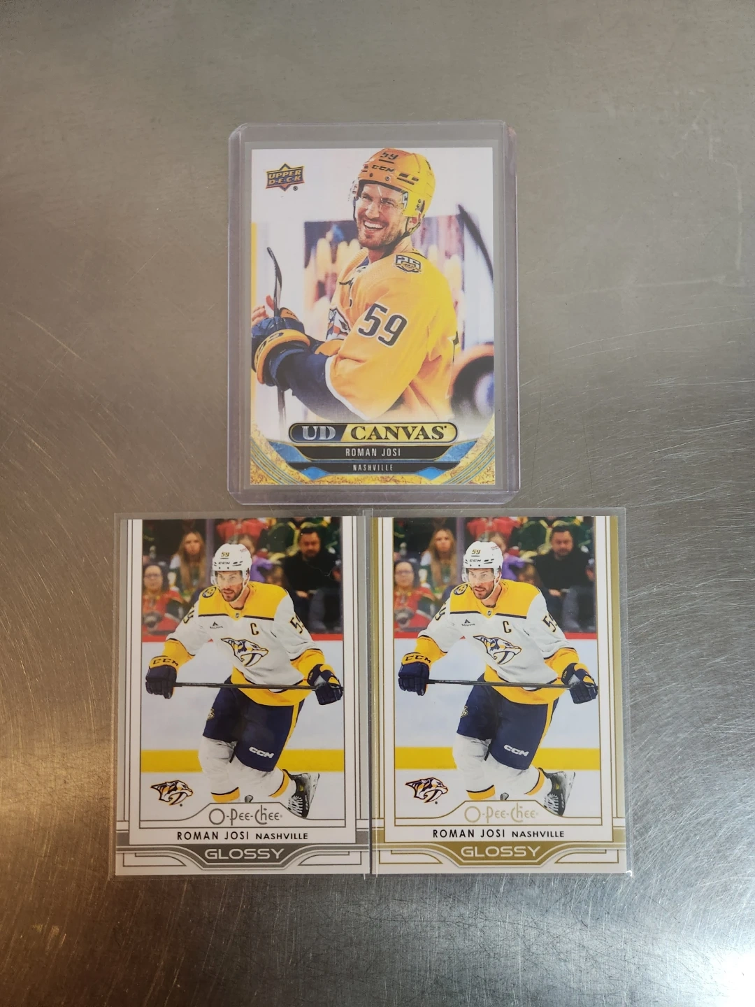 Collection of three Roman Josi hockey cards, featuring one UD Canvas card and two O-Pee-Chee Glossy cards. Perfect for any Nashville Predators fan looking to add to their collection. These cards showcase Roman Josi in his iconic Predators uniform.