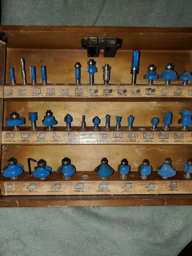 Perfect for woodworking enthusiasts and professionals. This set includes a variety of bits for different cutting and shaping needs. Here's what you'll get: * Various Router Bits * Wooden Storage Case Looking for $100 the blue bits aren't used they are all brand new. A few are missing but everything in the picture is included. Located in Port credit