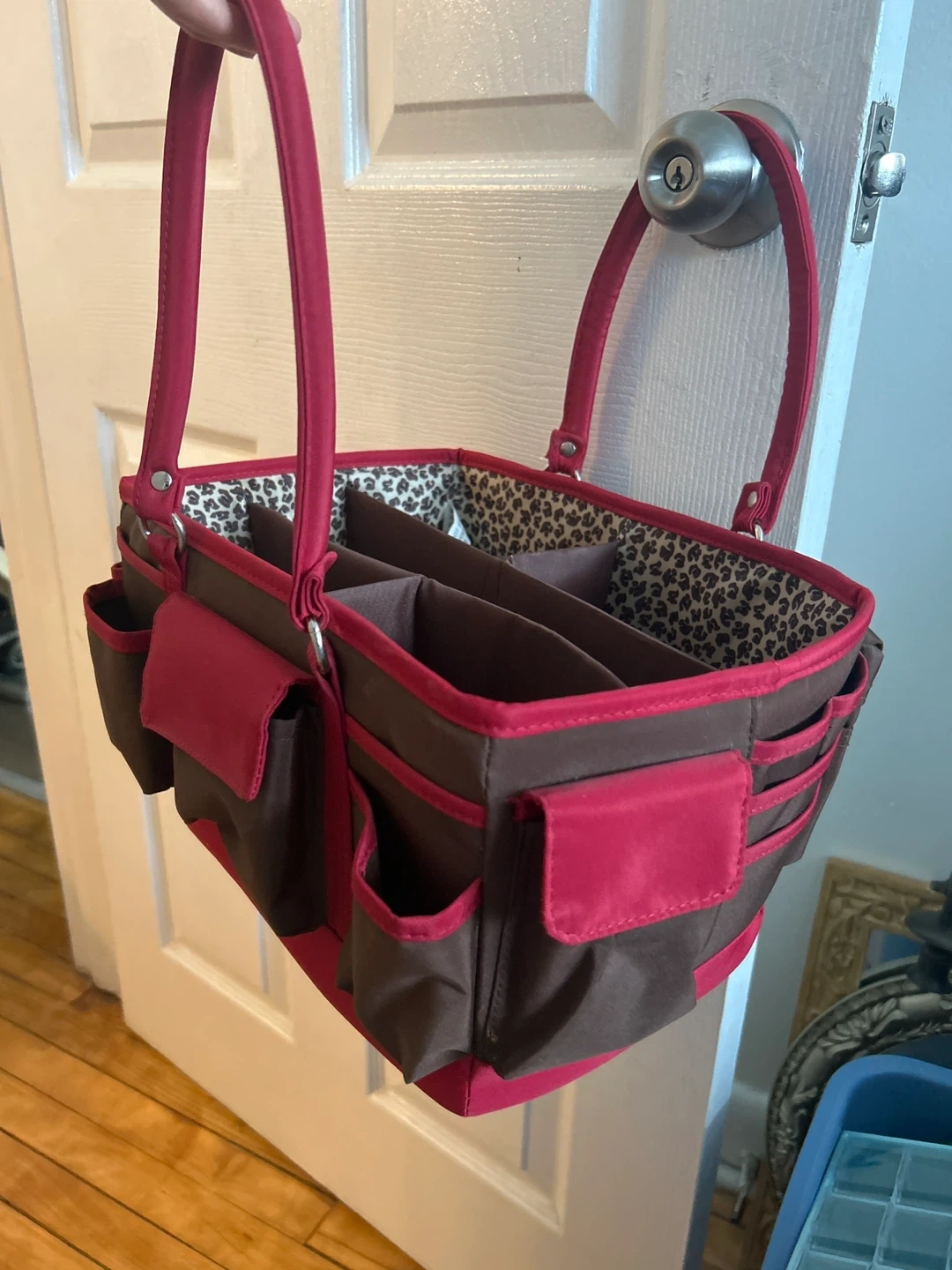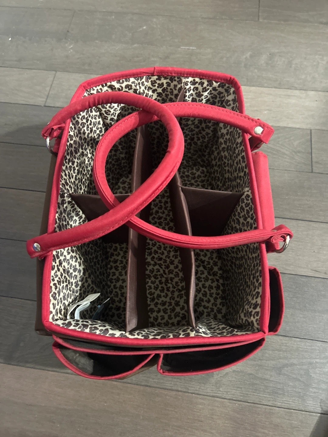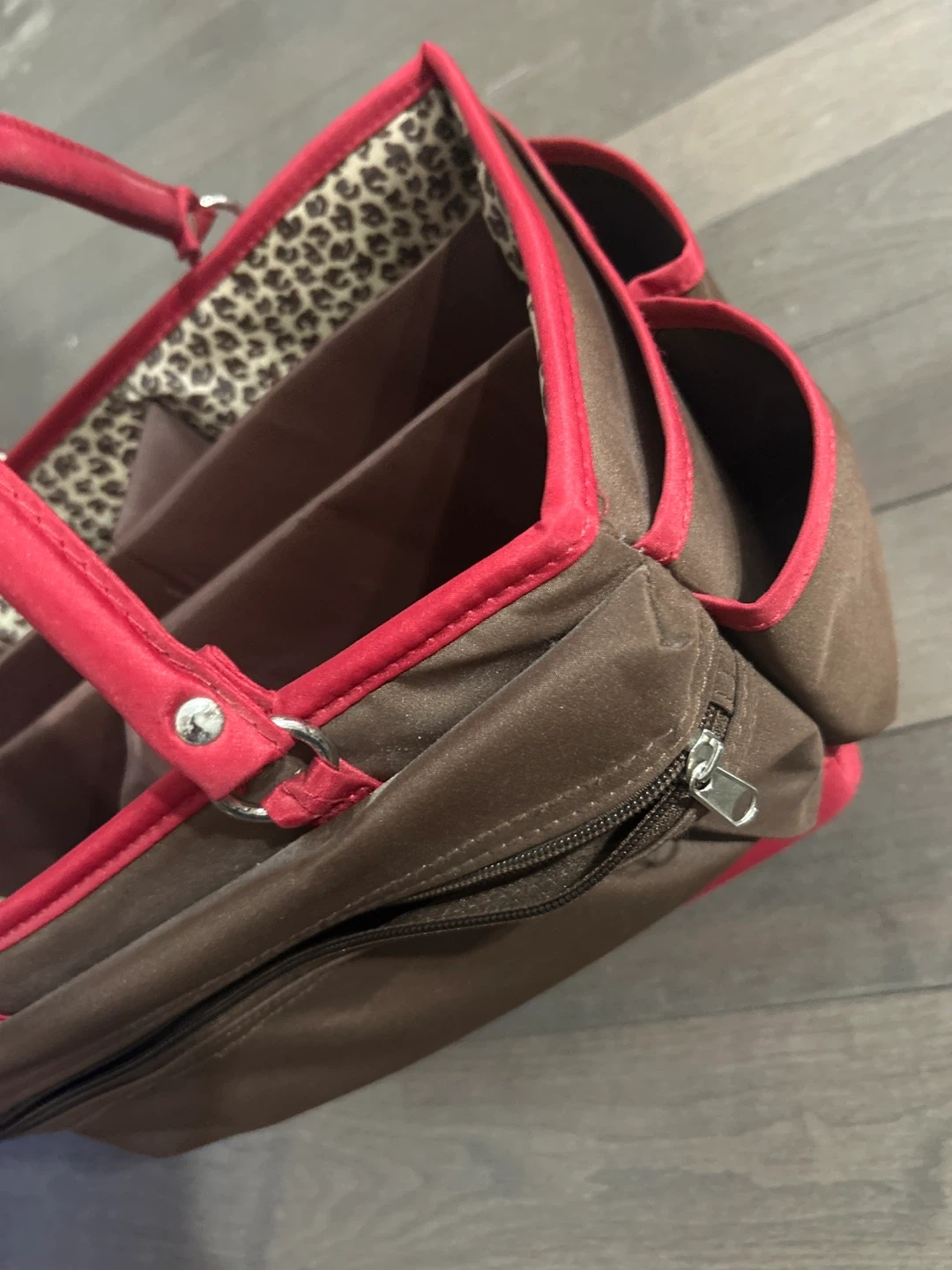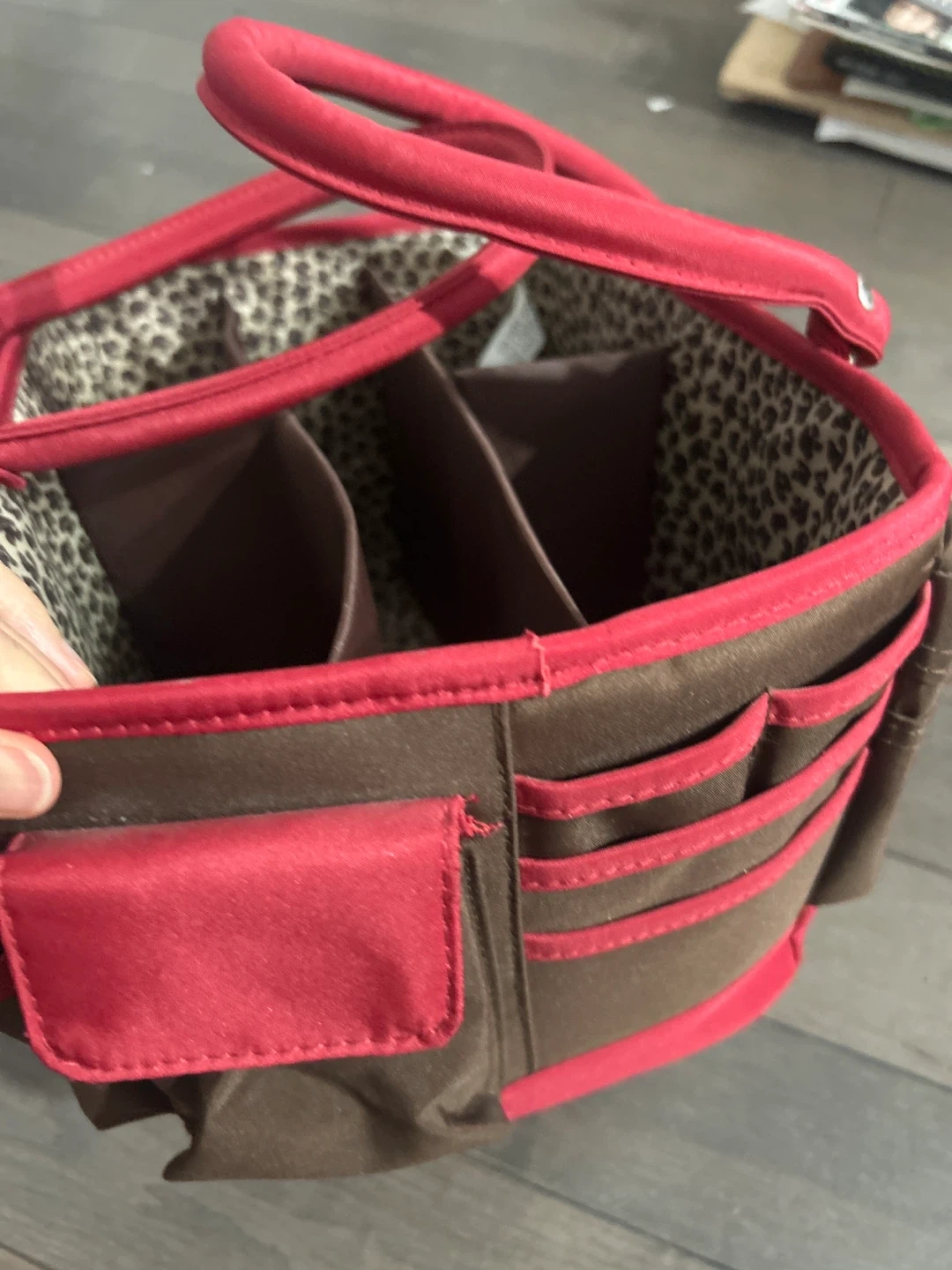 This is a cute tote bag in brown and red! It has a fun leopard print interior and several compartments to keep your items organized. It's perfect for carrying your essentials in style