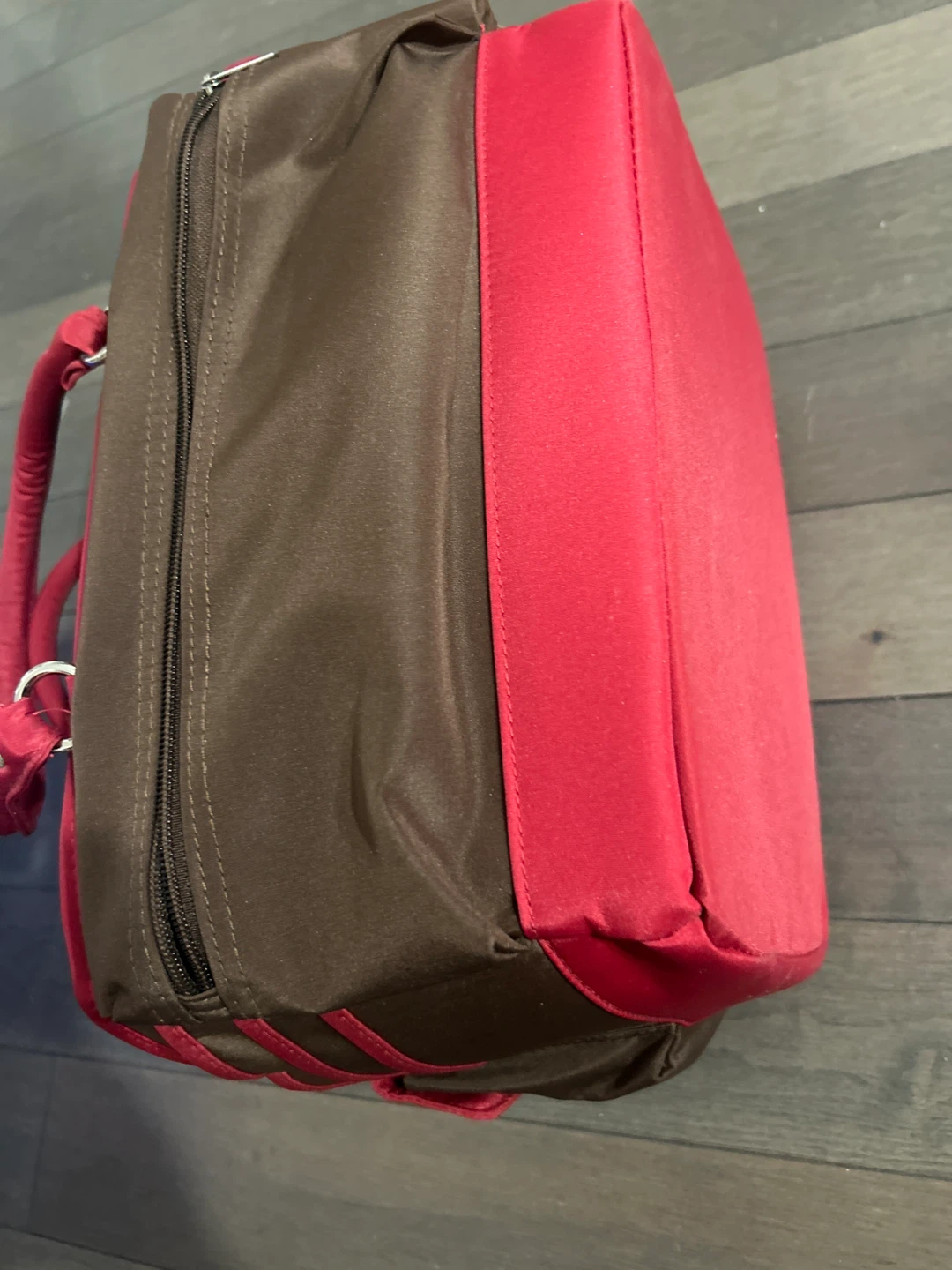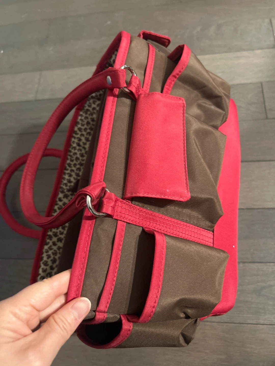 This is a cute tote bag in brown and red! It has a fun leopard print interior and several compartments to keep your items organized. It's perfect for carrying your essentials in style